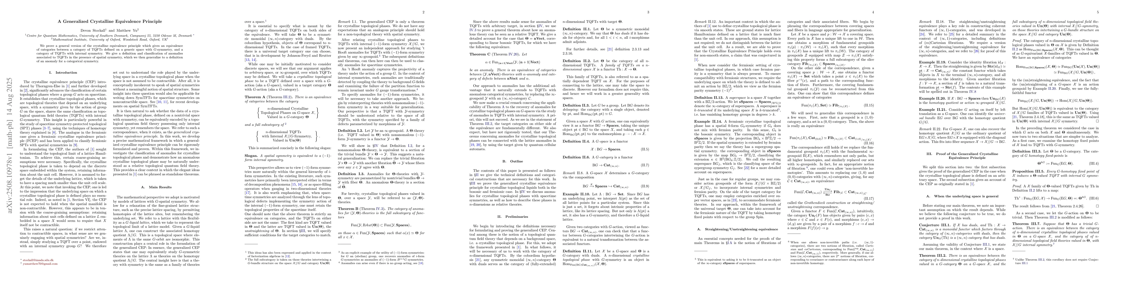 We prove a general version of the crystalline equivalence principle which gives an equivalence of categories between a category of TQFTs defined on a generic space with $G$-symmetry, and a category of TQFTs with internal symmetry. We give a definition and classification of anomalies associated to TQFTs in the presence of spatial symmetry, which we then generalize to a definition of an anomaly for a categorical symmetry.