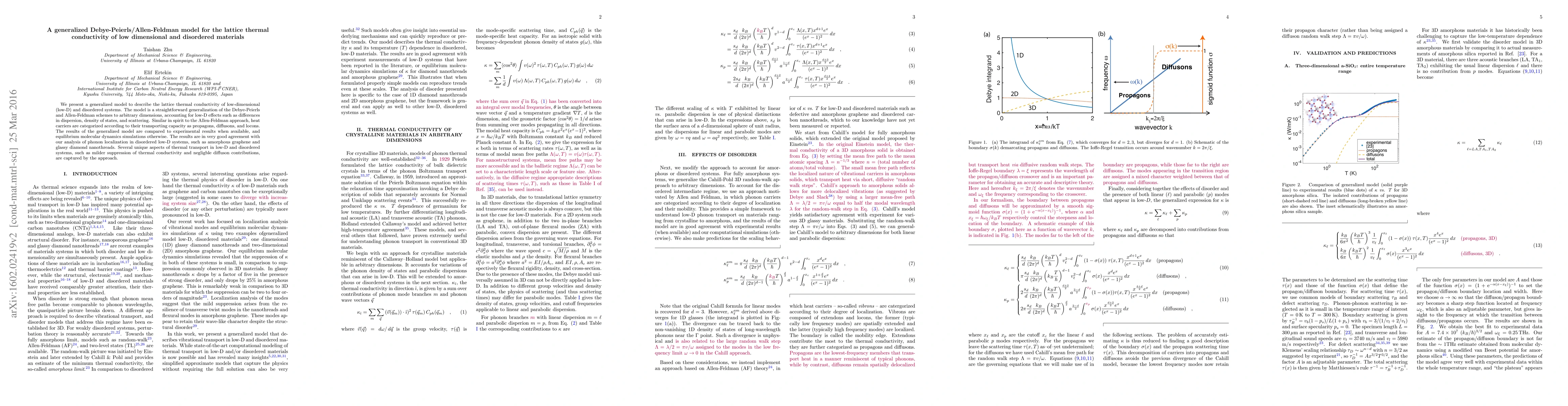 We present a generalized model to describe the lattice thermal conductivity of low-dimensional (low-D) and disordered systems. The model is a straightforward generalization of the Debye-Peierls and Allen-Feldman schemes to arbitrary dimensions, accounting for low-D effects such as differences in dispersion, density of states, and scattering. Similar in spirit to the Allen-Feldman approach, heat carriers are categorized according to their transporting capacity as propagons, diffusons, and locons. The results of the generalized model are compared to experimental results when available, and equilibrium molecular dynamics simulations otherwise. The results are in very good agreement with our analysis of phonon localization in disordered low-D systems, such as amorphous graphene and glassy diamond nanothreads. Several unique aspects of thermal transport in low-D and disordered systems, such as milder suppression of thermal conductivity and negligble diffuson contributions, are captured by the approach.