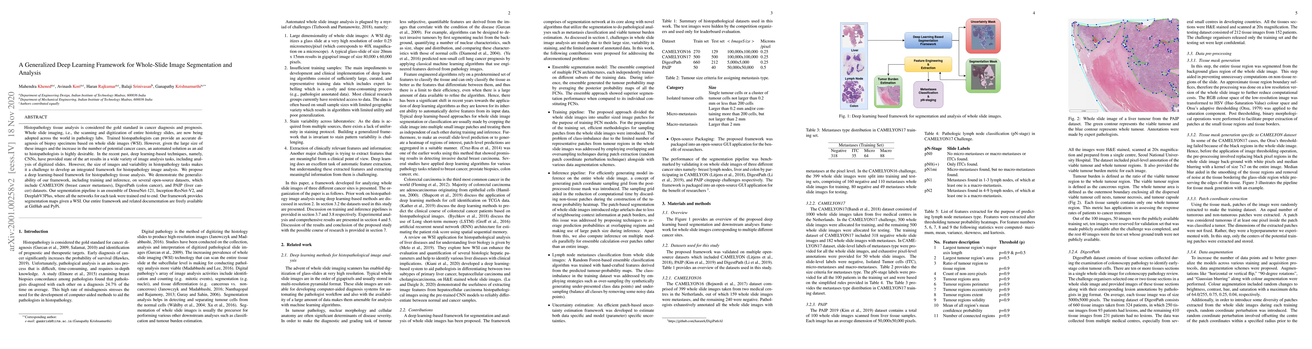 Histopathology tissue analysis is considered the gold standard in cancer diagnosis and prognosis. Given the large size of these images and the increase in the number of potential cancer cases, an automated solution as an aid to histopathologists is highly desirable. In the recent past, deep learning-based techniques have provided state of the art results in a wide variety of image analysis tasks, including analysis of digitized slides. However, the size of images and variability in histopathology tasks makes it a challenge to develop an integrated framework for histopathology image analysis. We propose a deep learning-based framework for histopathology tissue analysis. We demonstrate the generalizability of our framework, including training and inference, on several open-source datasets, which include CAMELYON (breast cancer metastases), DigestPath (colon cancer), and PAIP (liver cancer) datasets. We discuss multiple types of uncertainties pertaining to data and model, namely aleatoric and epistemic, respectively. Simultaneously, we demonstrate our model generalization across different data distribution by evaluating some samples on TCGA data. On CAMELYON16 test data (n=139) for the task of lesion detection, the FROC score achieved was 0.86 and in the CAMELYON17 test-data (n=500) for the task of pN-staging the Cohen's kappa score achieved was 0.9090 (third in the open leaderboard). On DigestPath test data (n=212) for the task of tumor segmentation, a Dice score of 0.782 was achieved (fourth in the challenge). On PAIP test data (n=40) for the task of viable tumor segmentation, a Jaccard Index of 0.75 (third in the challenge) was achieved, and for viable tumor burden, a score of 0.633 was achieved (second in the challenge). Our entire framework and related documentation are freely available at GitHub and PyPi.