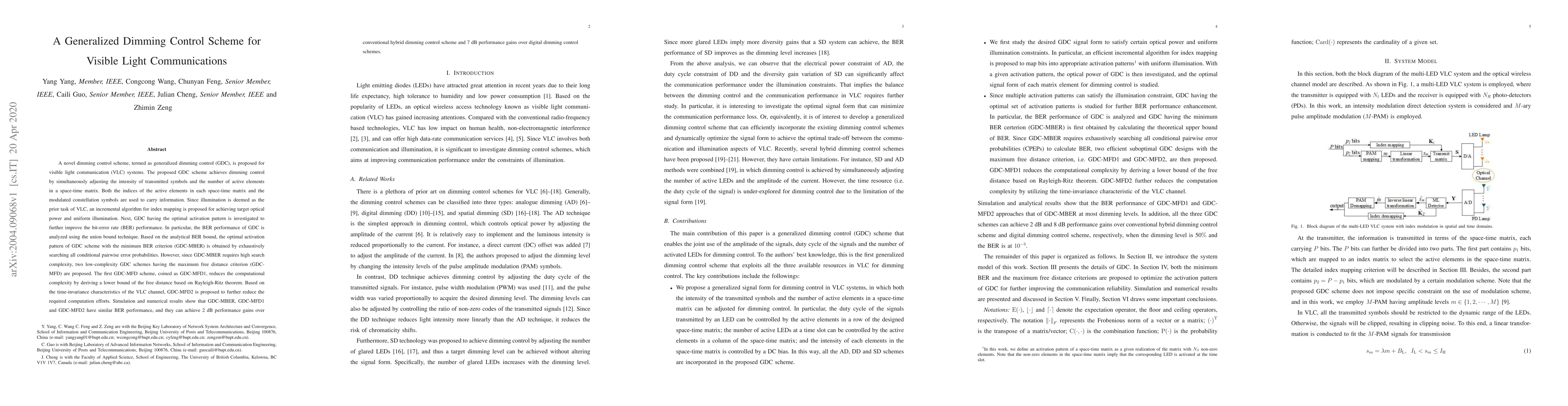 A novel dimming control scheme, termed as generalized dimming control (GDC), is proposed for visible light communication (VLC) systems. The proposed GDC scheme achieves dimming control by simultaneously adjusting the intensity of transmitted symbols and the number of active elements in a space-time matrix. Both the indices of the active elements in each space-time matrix and the modulated constellation symbols are used to carry information. Since illumination is deemed as the prior task of VLC, an incremental algorithm for index mapping is proposed for achieving target optical power and uniform illumination. Next, GDC having the optimal activation pattern is investigated to further improve the bit-error rate (BER) performance. In particular, the BER performance of GDC is analyzed using the union bound technique. Based on the analytical BER bound, the optimal activation pattern of GDC scheme with the minimum BER criterion (GDC-MBER) is obtained by exhaustively searching all conditional pairwise error probabilities. However, since GDC-MBER requires high search complexity, two low-complexity GDC schemes having the maximum free distance criterion (GDCMFD) are proposed. The first GDC-MFD scheme, coined as GDC-MFD1, reduces the computational complexity by deriving a lower bound of the free distance based on Rayleigh-Ritz theorem. Based on the time-invariance characteristics of the VLC channel, GDC-MFD2 is proposed to further reduce the required computation efforts. Simulation and numerical results show that GDC-MBER, GDC-MFD1 and GDC-MFD2 have similar BER performance, and they can achieve 2 dB performance gains over conventional hybrid dimming control scheme and 7 dB performance gains over digital dimming control schemes.