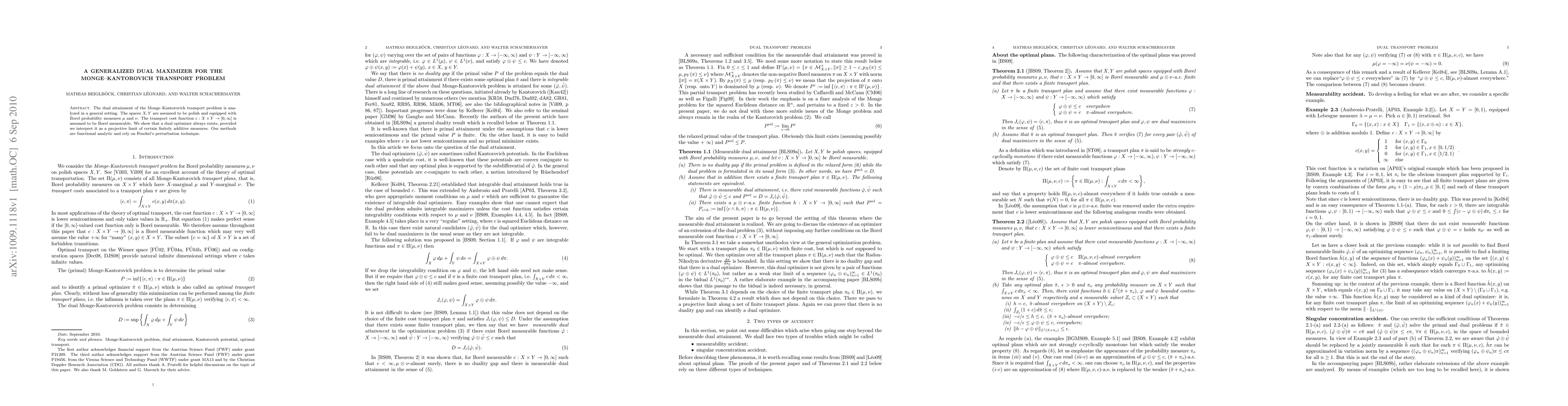 This paper demonstrates the existence of a dual optimizer for the Monge-Kantorovich transport problem in a general setting, where spaces $X$ and $Y$ are polish with Borel probability measures, and the cost function is Borel measurable. The solution is shown to be a projective limit of finitely additive measures, utilizing functional analytic methods and Fenchel's perturbation technique.