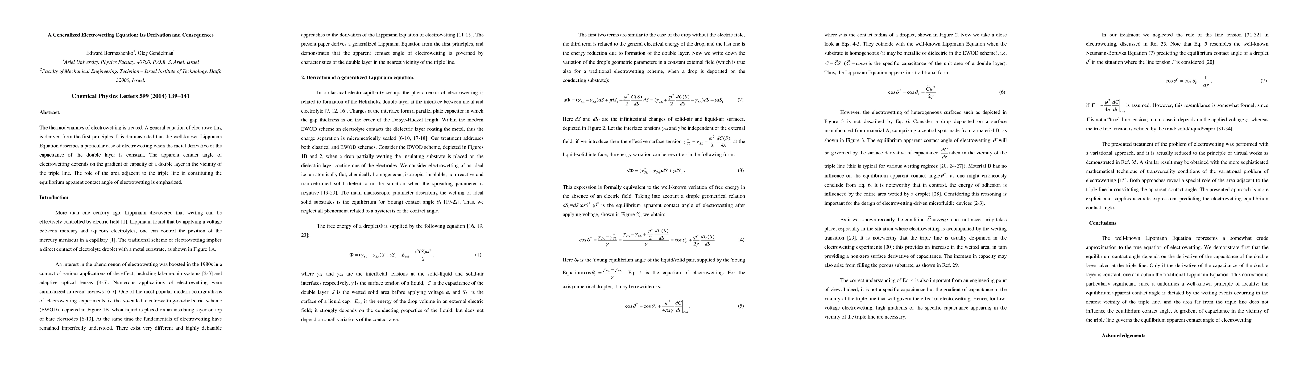 This paper derives a generalized electrowetting equation from first principles, showing that the traditional Lippmann Equation applies when the capacitance gradient is constant. It highlights the significance of the double layer's capacity gradient and the triple line's adjacent area in determining the equilibrium apparent contact angle in electrowetting.