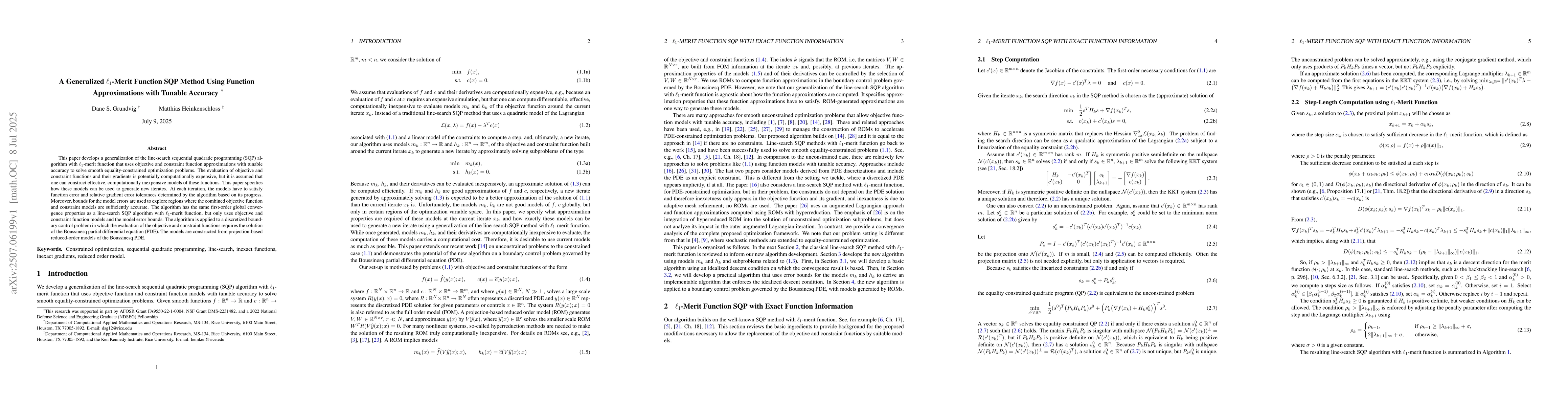 This paper develops a generalization of the line-search sequential quadratic programming (SQP) algorithm with $\ell_1$-merit function that uses objective and constraint function approximations with tunable accuracy to solve smooth equality-constrained optimization problems. The evaluation of objective and constraint functions and their gradients is potentially computationally expensive, but it is assumed that one can construct effective, computationally inexpensive models of these functions. This paper specifies how these models can be used to generate new iterates. At each iteration, the models have to satisfy function error and relative gradient error tolerances determined by the algorithm based on its progress. Moreover, bounds for the model errors are used to explore regions where the combined objective function and constraint models are sufficiently accurate. The algorithm has the same first-order global convergence properties as a line-search SQP algorithm with $\ell_1$-merit function, but only uses objective and constraint function models and the model error bounds. The algorithm is applied to a discretized boundary control problem in which the evaluation of the objective and constraint functions requires the solution of the Boussinesq partial differential equation (PDE). The models are constructed from projection-based reduced-order models of the Boussinesq PDE.