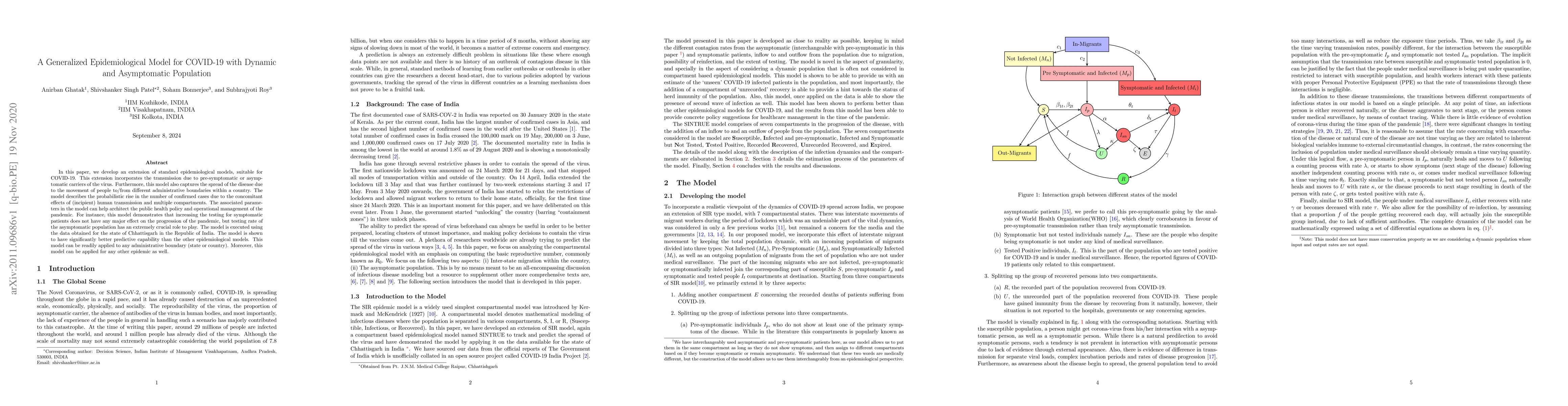 In this paper, we develop an extension of standard epidemiological models, suitable for COVID-19. This extension incorporates the transmission due to pre-symptomatic or asymptomatic carriers of the virus. Furthermore, this model also captures the spread of the disease due to the movement of people to/from different administrative boundaries within a country. The model describes the probabilistic rise in the number of confirmed cases due to the concomitant effects of (incipient) human transmission and multiple compartments. The associated parameters in the model can help architect the public health policy and operational management of the pandemic. For instance, this model demonstrates that increasing the testing for symptomatic patients does not have any major effect on the progression of the pandemic, but testing rate of the asymptomatic population has an extremely crucial role to play. The model is executed using the data obtained for the state of Chhattisgarh in the Republic of India. The model is shown to have significantly better predictive capability than the other epidemiological models. This model can be readily applied to any administrative boundary (state or country). Moreover, this model can be applied for any other epidemic as well.