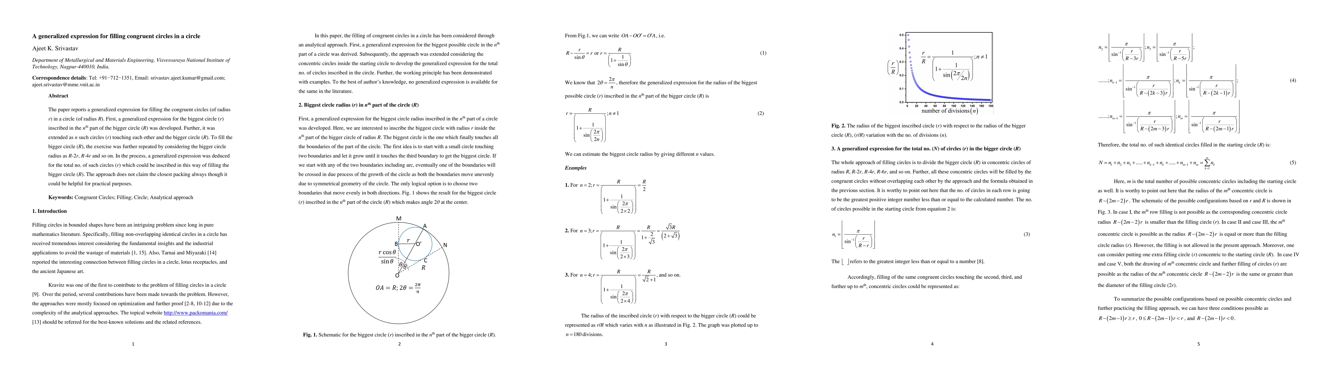 The paper reports a generalized expression for filling the congruent circles (of radius r) in a circle (of radius R). First, a generalized expression for the biggest circle (r) inscribed in the nth part of the bigger circle (R) was developed. Further, it was extended as n such circles (r) touching each other and the bigger circle (R). To fill the bigger circle (R), the exercise was further repeated by considering the bigger circle radius as R-2r, R-4r and so on. In the process, a generalized expression was deduced for the total no. of such circles (r) which could be inscribed in this way of filling the bigger circle (R). The approach does not claim the closest packing always though it could be helpful for practical purposes.
