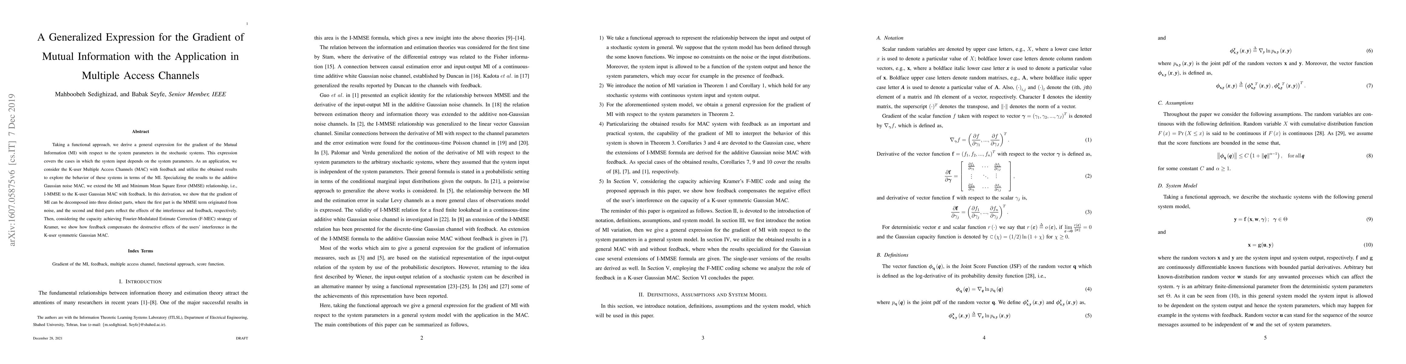 Taking a functional approach, we derive a general expression for the gradient of the Mutual Information (MI) with respect to the system parameters in the stochastic systems. This expression covers the cases in which the system input depends on the system parameters. As an application, we consider the K-user Multiple Access Channels (MAC) with feedback and utilize the obtained results to explore the behavior of these systems in terms of the MI. Specializing the results to the additive Gaussian noise MAC, we extend the MI and Minimum Mean Square Error (MMSE) relationship, i.e., I-MMSE to the K-user Gaussian MAC with feedback. In this derivation, we show that the gradient of MI can be decomposed into three distinct parts, where the first part is the MMSE term originated from noise, and the second and third parts reflect the effects of the interference and feedback, respectively. Then, considering the capacity achieving Fourier-Modulated Estimate Correction (F-MEC) strategy of Kramer, we show how feedback compensates the destructive effects of the users' interference in the K-user symmetric Gaussian MAC.