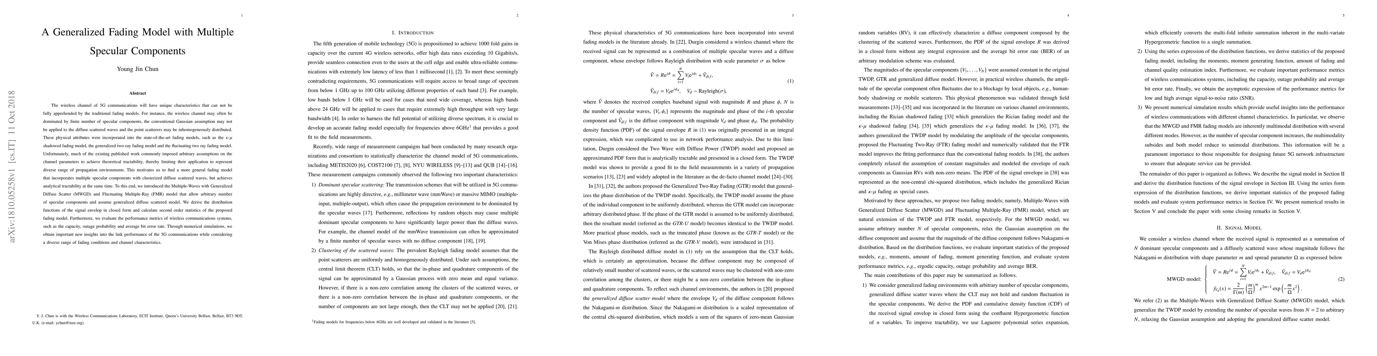 The wireless channel of 5G communications will have unique characteristics that can not be fully apprehended by the traditional fading models. For instance, the wireless channel may often be dominated by a finite number of specular components, the conventional Gaussian assumption may not be applied to the diffuse scattered waves and the point scatterers may be inhomogeneously distributed. These physical attributes were incorporated into the state-of-the-art fading models, such as the kappa-mu shadowed fading model, the generalized two-ray fading model, and the fluctuating two ray fading model. Unfortunately, much of the existing published work commonly imposed arbitrary assumptions on the channel parameters to achieve theoretical tractability, thereby limiting their application to represent a diverse range of propagation environments. This motivates us to find a more general fading model that incorporates multiple specular components with clusterized diffuse scattered waves, but achieves analytical tractability at the same time. To this end, we introduced the Multiple-Waves with Generalized Diffuse Scatter (MWGD) and Fluctuating Multiple-Ray (FMR) model that allow an arbitrary number of specular components and assume generalized diffuse scattered model. We derive the distribution functions of the signal envelop in closed form and calculate second order statistics of the proposed fading model. Furthermore, we evaluate the performance metrics of wireless communications systems, such as the capacity, outage probability, and average bit error rate. Through numerical simulations, we obtain important new insights into the link performance of the 5G communications while considering a diverse range of fading conditions and channel characteristics.