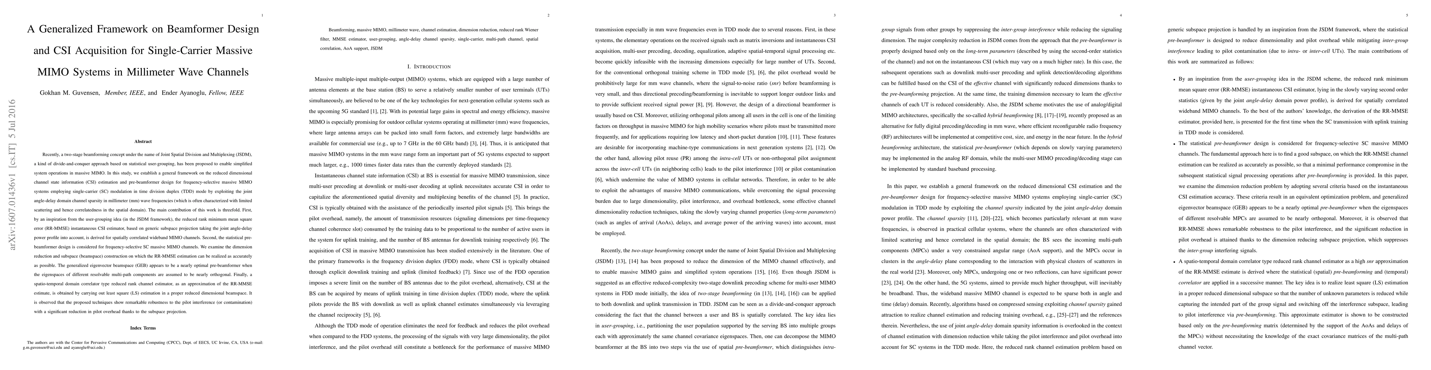 This paper proposes a generalized framework for reduced dimensional CSI estimation and pre-beamformer design for single-carrier massive MIMO systems in millimeter wave channels, leveraging joint angle-delay domain channel sparsity. The framework includes a reduced rank MMSE estimator and a statistical pre-beamformer design, demonstrating robustness against pilot interference and reduced pilot overhead.