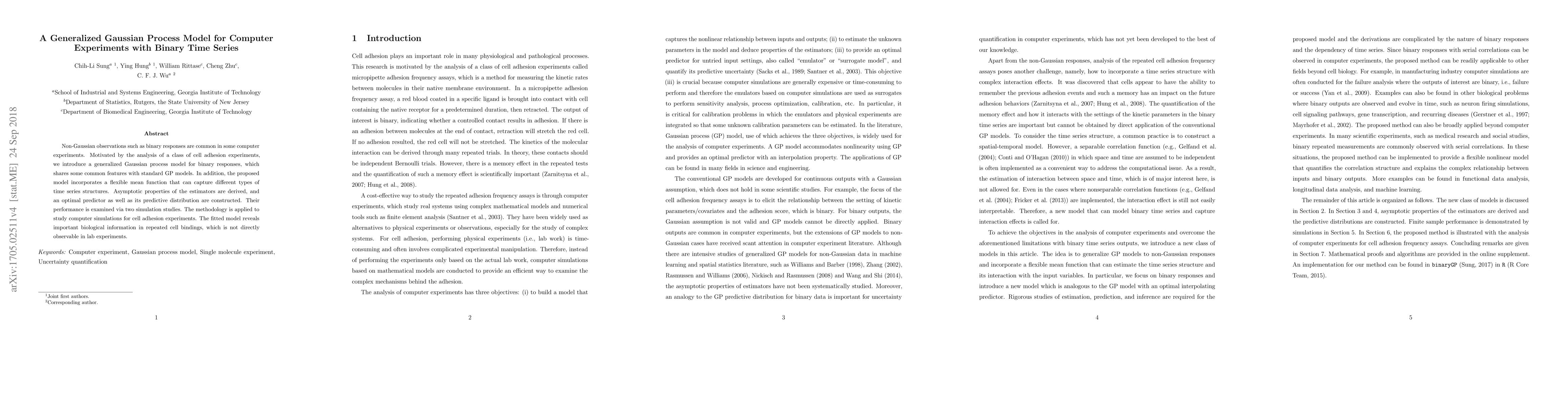 This paper introduces a generalized Gaussian process model for binary time series data, suitable for non-Gaussian observations in computer experiments. The model features a flexible mean function to capture various time series structures and is applied to analyze cell adhesion experiments, revealing important biological insights.