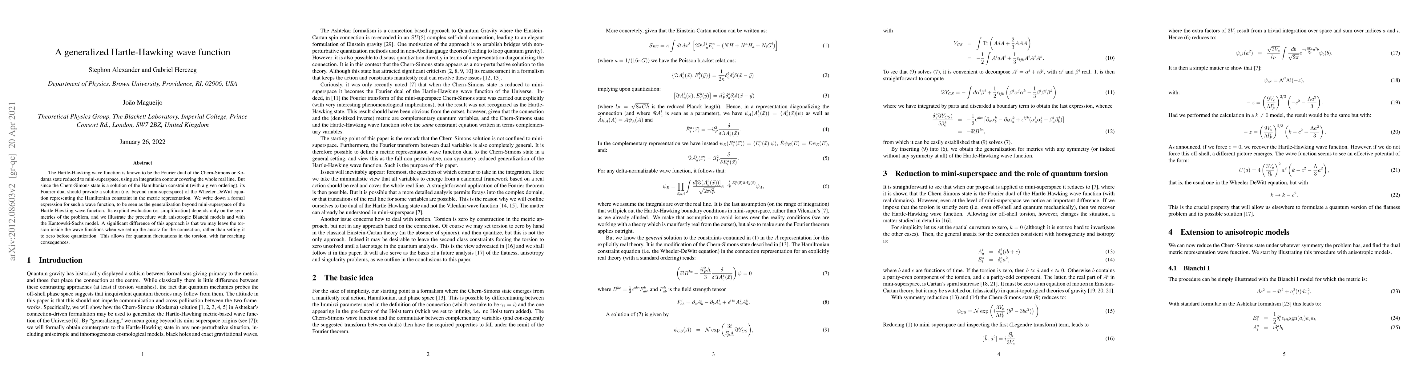 The Hartle-Hawking wave function is known to be the Fourier dual of the Chern-Simons or Kodama state reduced to mini-superspace, using an integration contour covering the whole real line. But since the Chern-Simons state is a general solution of the Hamiltonian constraint (with a given ordering), its Fourier dual should provide the general solution (i.e. beyond mini-superspace) of the Wheeler DeWitt equation representing the Hamiltonian constraint in the metric representation. We write down a formal expression for such a wave function, to be seen as the generalization beyond mini-superspace of the Hartle-Hawking wave function. Its explicit evaluation (or simplification) depends only on the symmetries of the problem, and we illustrate the procedure with anisotropic Bianchi models and with the Kantowski-Sachs model. A significant difference of this approach is that we may leave the torsion inside the wave functions when we set up the ansatz for the connection, rather than setting it to zero before quantization. This allows for quantum fluctuations in the torsion, with far reaching consequences.