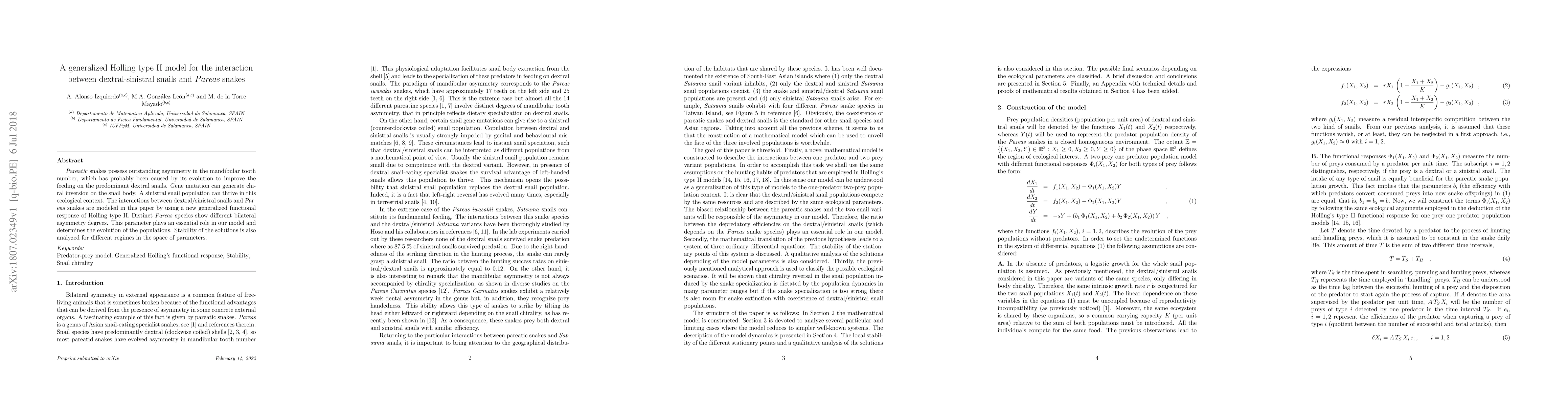 Pareatic snakes possess outstanding asymmetry in the mandibular tooth number, which has probably been caused by its evolution to improve the feeding on the predominant dextral snails. Gene mutation can generate chiral inversion on the snail body. A sinistral snail population can thrive in this ecological context. The interactions between dextral/sinistral snails and Pareas snakes are modeled in this paper by using a new generalized functional response of Holling type II. Distinct Pareas species show different bilateral asymmetry degrees. This parameter plays an essential role in our model and determines the evolution of the populations. Stability of the solutions is also analyzed for different regimes in the space of parameters.