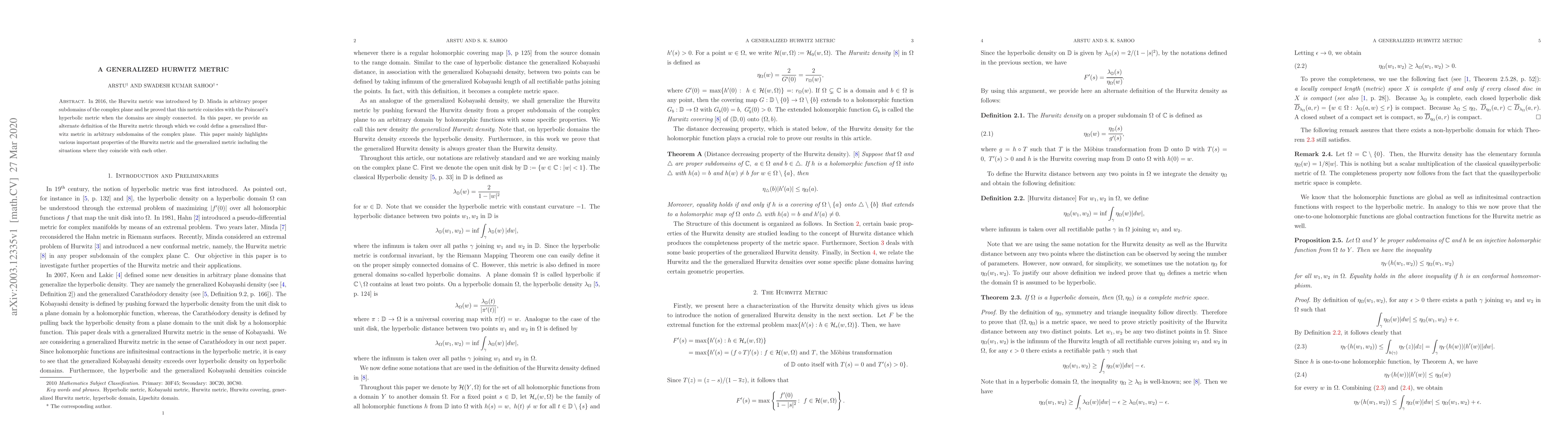 This paper introduces a generalized Hurwitz metric in arbitrary subdomains of the complex plane, providing an alternate definition that extends the original Hurwitz metric. It explores various properties of both the Hurwitz and generalized metrics, highlighting their coincidence in specific cases.