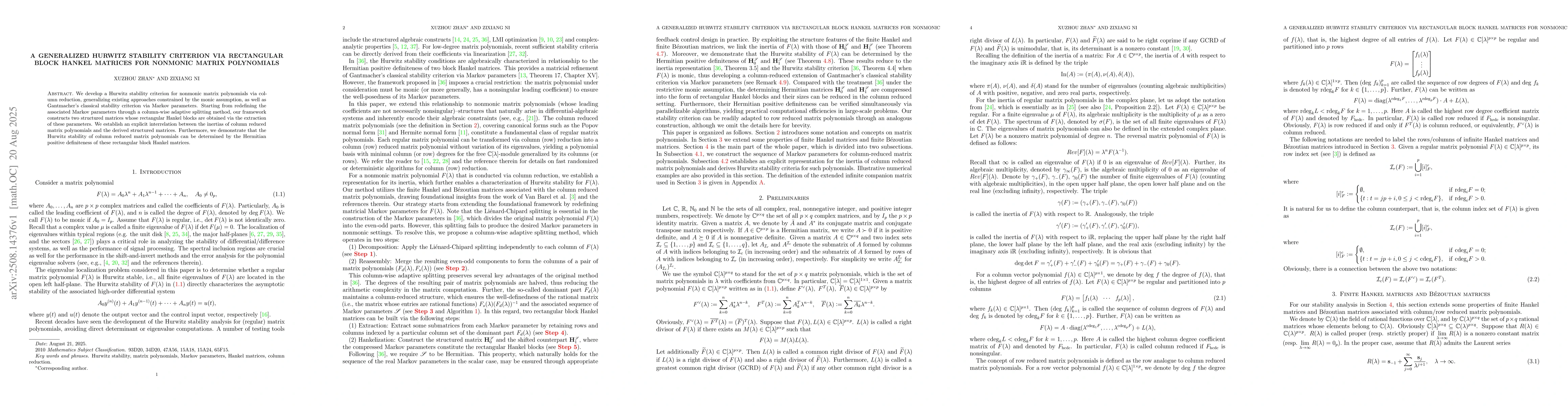 The paper introduces a novel framework for Hurwitz stability analysis of nonmonic matrix polynomials, utilizing rectangular block Hankel matrices derived from Markov parameters via adaptive column-wise splitting.