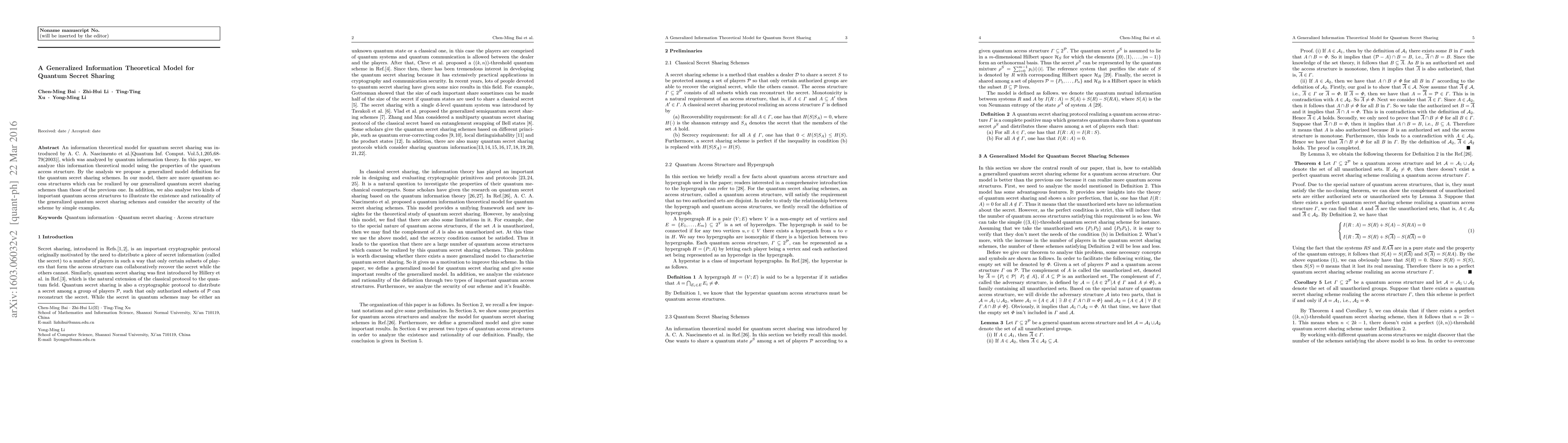 This paper generalizes an existing information theoretical model for quantum secret sharing, proposing a broader framework that accommodates more quantum access structures. It analyzes the security and rationality of the generalized model through specific examples and two important quantum access structures.