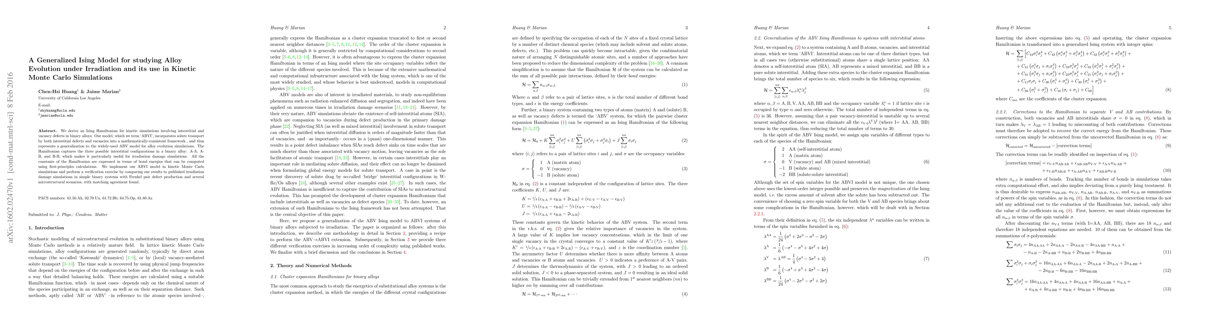 This paper presents a generalized Ising model termed ABVI for simulating alloy evolution under irradiation, incorporating solute transport via interstitial defects and vacancies. The model accurately captures three interstitial configurations and is validated through kinetic Monte Carlo simulations, showing agreement with published irradiation damage studies in binary systems.