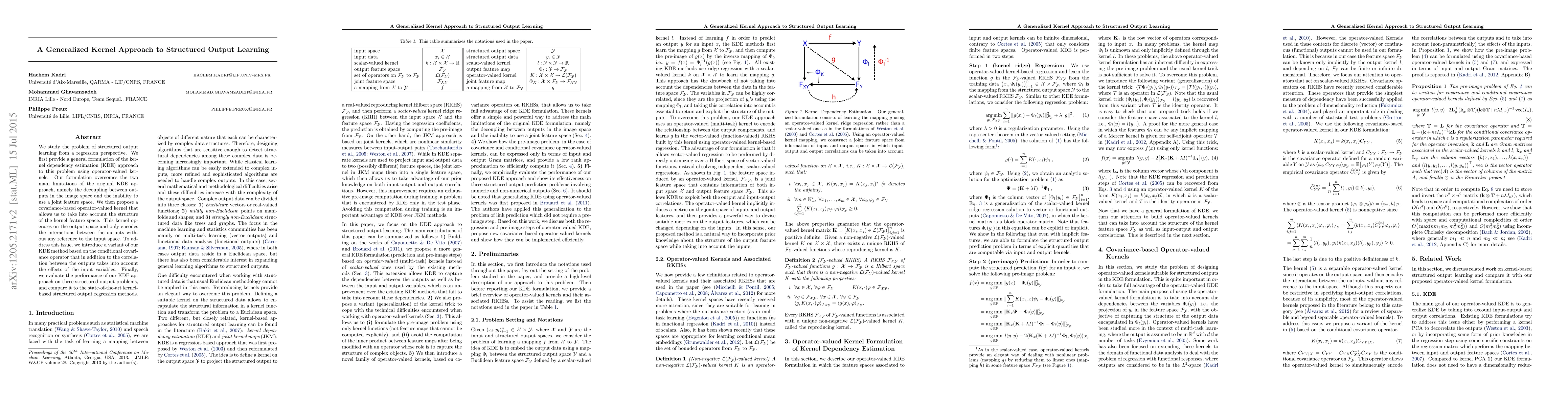 This paper presents a generalized kernel approach for structured output learning, formulating the kernel dependency estimation problem using operator-valued kernels. It introduces a covariance-based operator-valued kernel that captures the output structure and evaluates its performance on structured output problems, comparing it to existing methods.