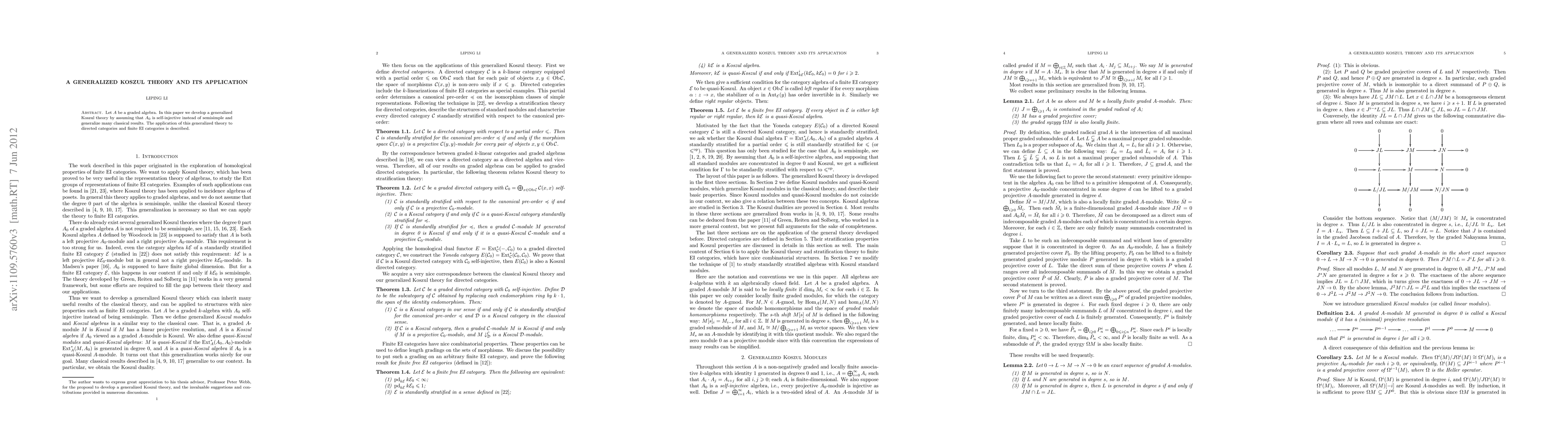 This paper develops a generalized Koszul theory for graded algebras where the base algebra is self-injective rather than semisimple, extending classical results. It applies this theory to directed categories and finite EI categories.