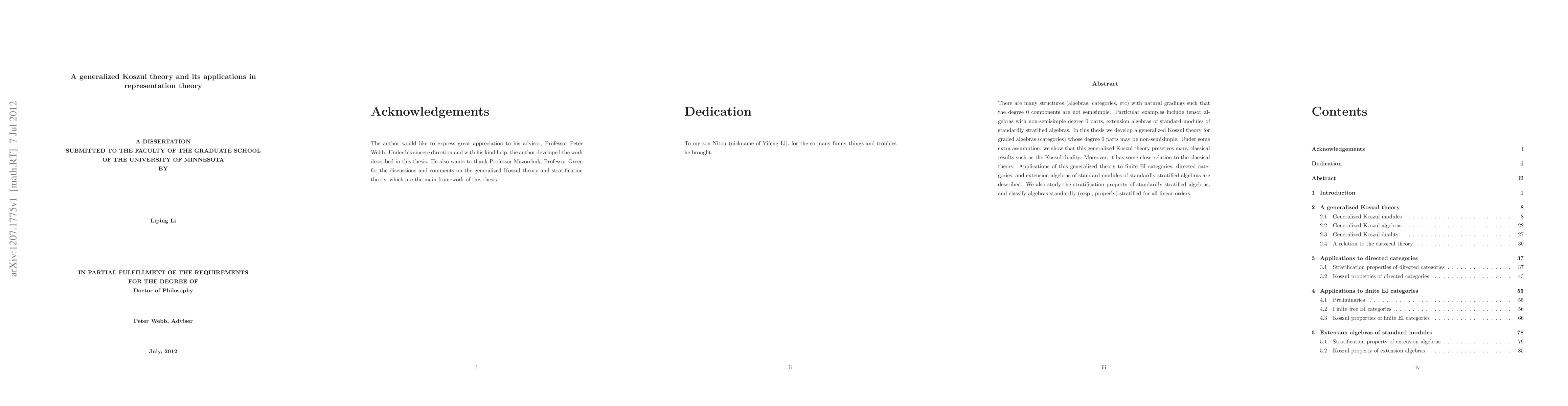 There are many structures (algebras, categories, etc) with natural gradings such that the degree 0 components are not semisimple. Particular examples include tensor algebras with non-semisimple degree 0 parts, extension algebras of standard modules of standardly stratified algebras. In this thesis we develop a generalized Koszul theory for graded algebras (categories) whose degree 0 parts may be non-semisimple. Under some extra assumption, we show that this generalized Koszul theory preserves many classical results such as the Koszul duality. Moreover, it has some close relation to the classical theory. Applications of this generalized theory to finite EI categories, directed categories, and extension algebras of standard modules of standardly stratified algebras are described. We also study the stratification property of standardly stratified algebras, and classify algebras standardly (resp., properly) stratified for all linear orders.