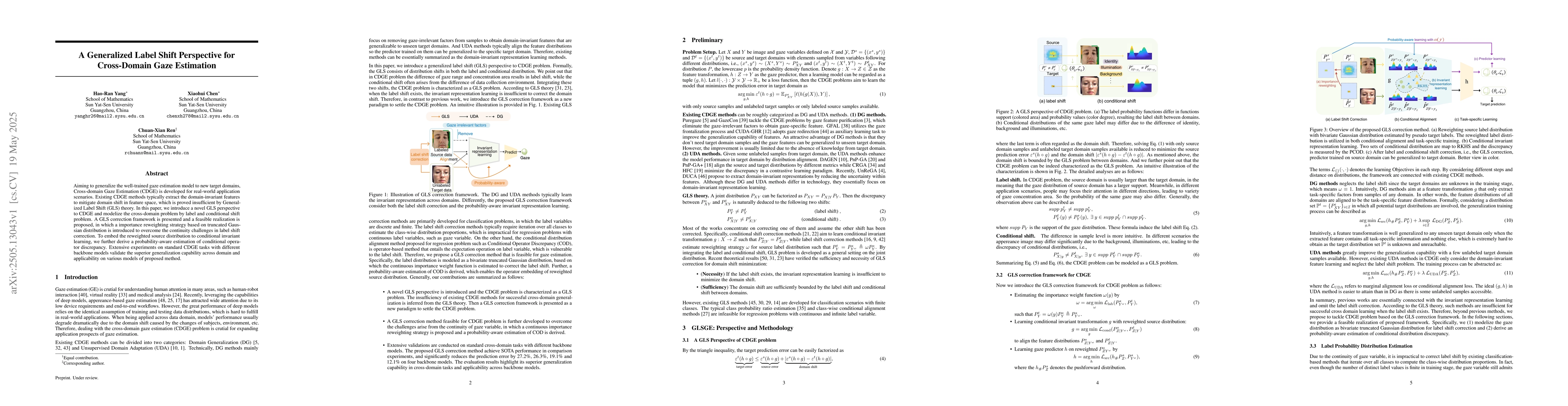 The paper introduces a Generalized Label Shift (GLS) perspective to Cross-Domain Gaze Estimation (CDGE), modeling the cross-domain problem as a label and conditional shift issue. It proposes a GLS correction framework with an importance reweighting strategy based on truncated Gaussian distribution to address label shift continuity challenges. Additionally, it derives a probability-aware estimation of conditional operator discrepancy to embed reweighted source distribution into conditional invariant learning.