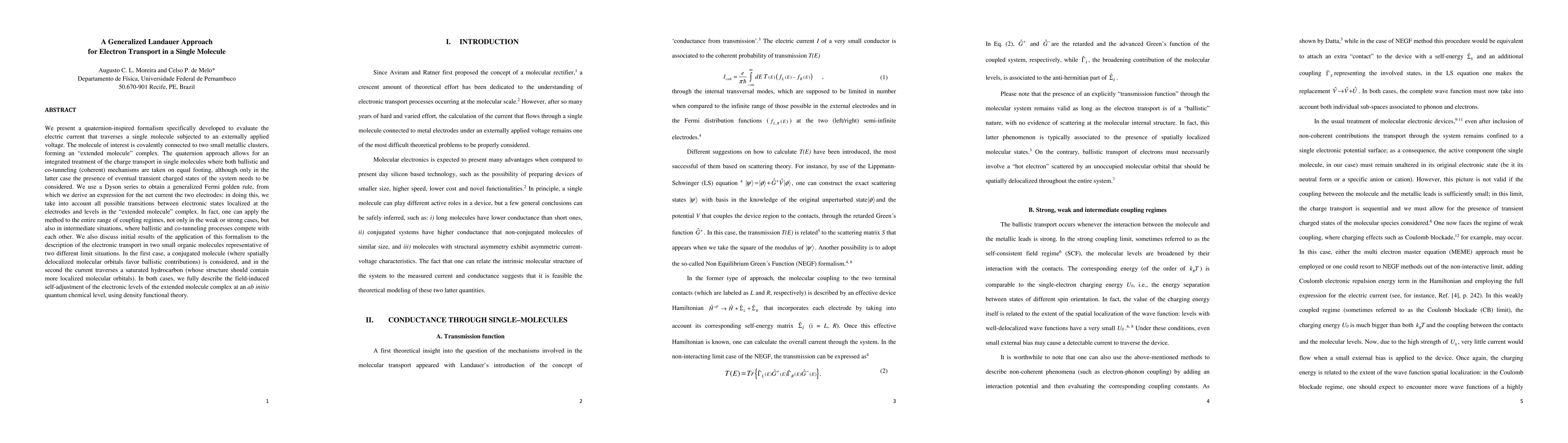 We present a quaternion-inspired formalism specifically developed to evaluate the electric current that traverses a single molecule subjected to an externally applied voltage. The molecule of interest is covalently connected to two small metallic clusters, forming an extended molecule complex. The quaternion approach allows for an integrated treatment of the charge transport in single molecules where both ballistic and co-tunneling (coherent) mechanisms are taken on equal footing, although only in the latter case the presence of eventual transient charged states of the system needs to be considered. We use a Dyson series to obtain a generalized Fermi golden rule, from which we derive an expression for the net current the two electrodes: in doing this, we take into account all possible transitions between electronic states localized at the electrodes and levels in the extended molecule complex. In fact, one can apply the method to the entire range of coupling regimes, not only in the weak or strong cases, but also in intermediate situations, where ballistic and co-tunneling processes compete with each other. We also discuss initial results of the application of this formalism to the description of the electronic transport in two small organic molecules representative of two different limit situations. In the first case, a conjugated molecule (where spatially delocalized molecular orbitals favor ballistic contributions) is considered, and in the second, the current traverses a saturated hydrocarbon (whose structure should contain more localized molecular orbitals). In both cases, we fully describe the field-induced self-adjustment of the electronic levels of the extended molecule complex at an ab initio quantum chemical level, using density functional theory.