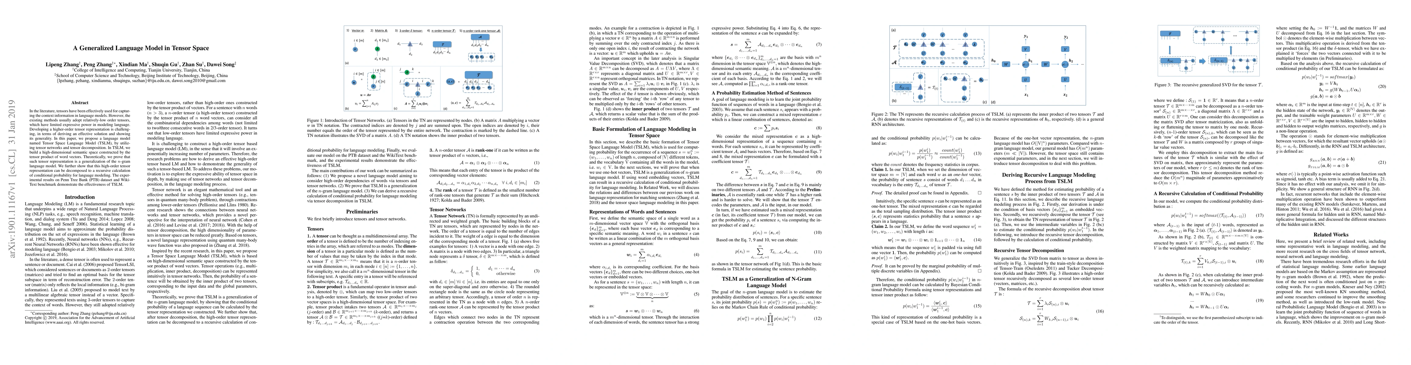 A new language model called Tensor Space Language Model (TSLM) uses high-order tensors to capture context information, outperforming existing methods on the Penn Tree Bank and WikiText benchmarks.
