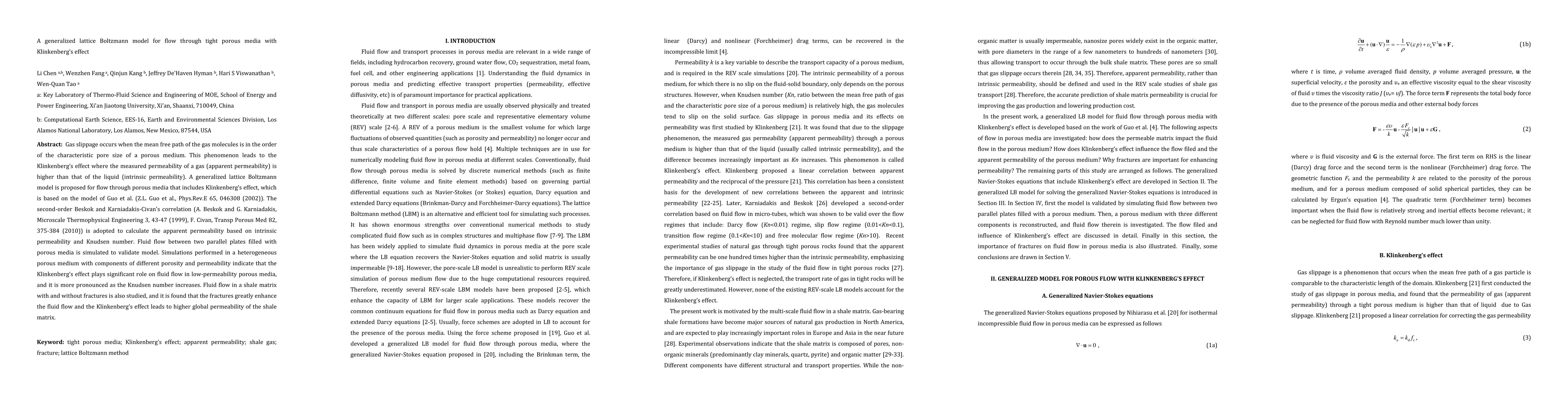 This paper proposes a generalized lattice Boltzmann model to simulate gas flow through tight porous media, incorporating Klinkenberg's effect due to gas slippage. The model validates the significant role of Klinkenberg's effect in low-permeability media, especially at higher Knudsen numbers, and demonstrates enhanced fluid flow in fractured shale matrices.