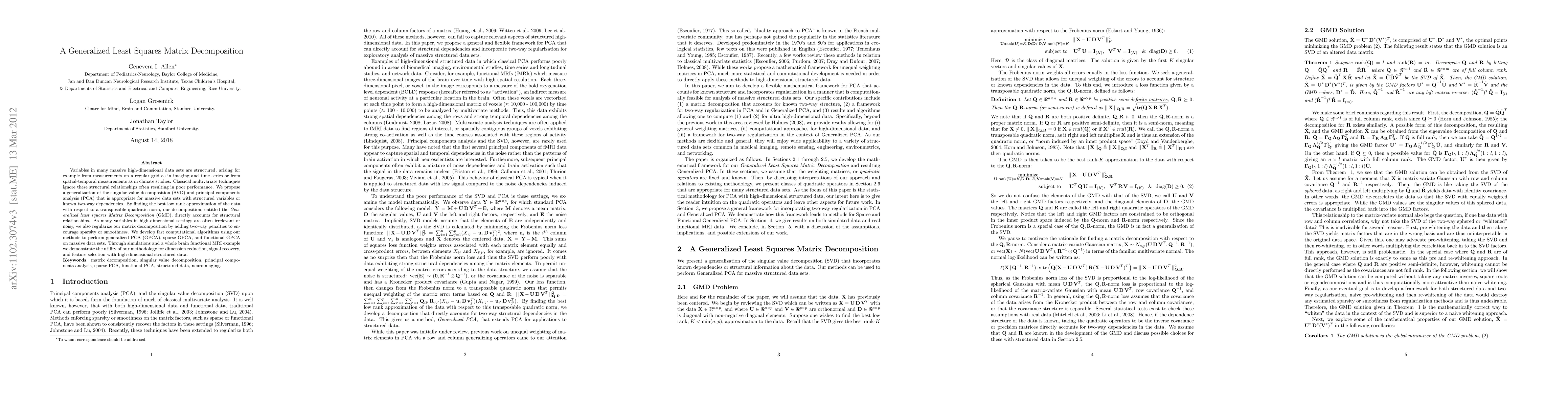 Variables in many massive high-dimensional data sets are structured, arising for example from measurements on a regular grid as in imaging and time series or from spatial-temporal measurements as in climate studies. Classical multivariate techniques ignore these structural relationships often resulting in poor performance. We propose a generalization of the singular value decomposition (SVD) and principal components analysis (PCA) that is appropriate for massive data sets with structured variables or known two-way dependencies. By finding the best low rank approximation of the data with respect to a transposable quadratic norm, our decomposition, entitled the Generalized least squares Matrix Decomposition (GMD), directly accounts for structural relationships. As many variables in high-dimensional settings are often irrelevant or noisy, we also regularize our matrix decomposition by adding two-way penalties to encourage sparsity or smoothness. We develop fast computational algorithms using our methods to perform generalized PCA (GPCA), sparse GPCA, and functional GPCA on massive data sets. Through simulations and a whole brain functional MRI example we demonstrate the utility of our methodology for dimension reduction, signal recovery, and feature selection with high-dimensional structured data.