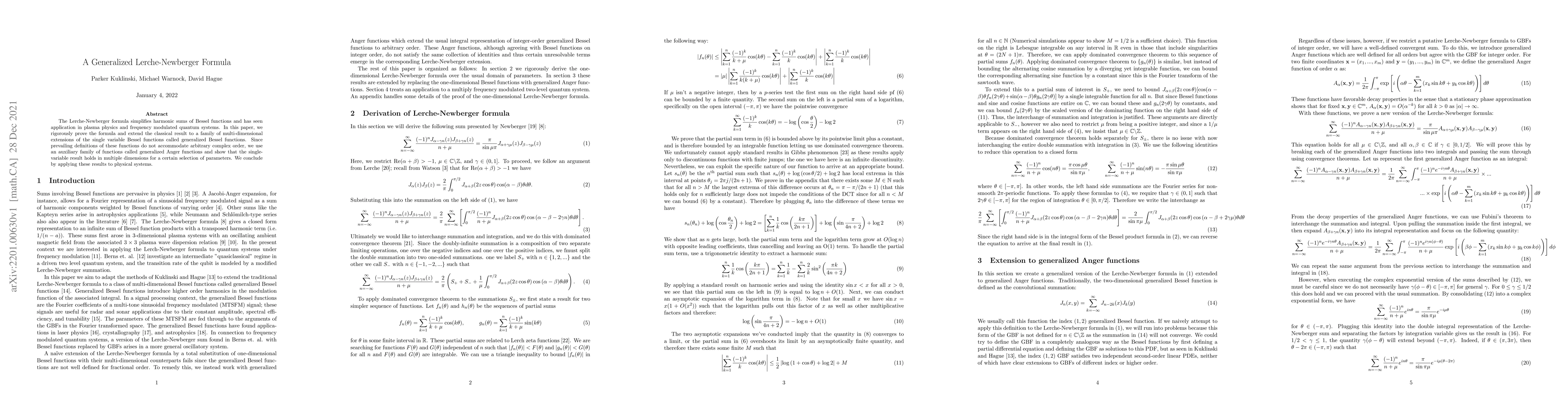 The Lerche-Newberger formula simplifies harmonic sums of Bessel functions and has seen application in plasma physics and frequency modulated quantum systems. In this paper, we rigorously prove the formula and extend the classical result to a family of multi-dimensional extensions of the single variable Bessel functions called generalized Bessel functions. Since prevailing definitions of these functions do not accommodate arbitrary complex order, we use an auxiliary family of functions called generalized Anger functions and show that the single-variable result holds in multiple dimensions for a certain selection of parameters. We conclude by applying these results to physical systems.