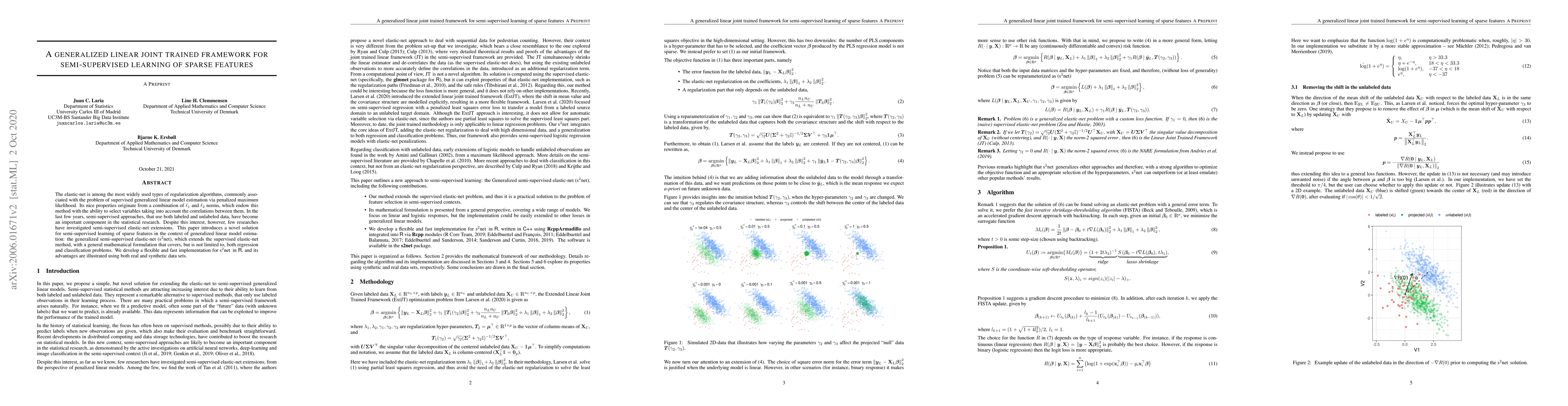 This paper introduces a generalized semi-supervised elastic-net (s2net) framework for sparse feature learning in generalized linear models, extending the supervised elastic-net to incorporate both labeled and unlabeled data. The method is implemented in R and demonstrated to be effective on real and synthetic datasets.