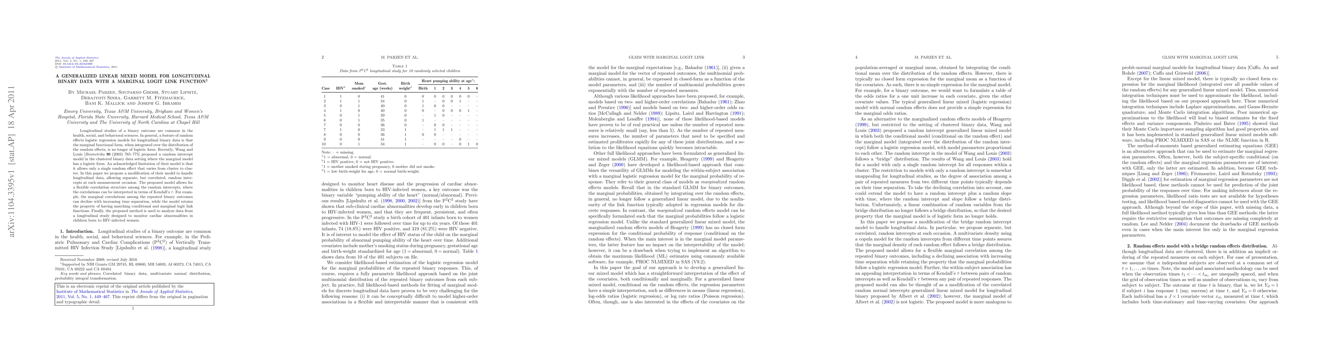 This paper proposes a generalized linear mixed model for longitudinal binary data that allows for separate, correlated random intercepts at each measurement occasion, addressing the limitation of existing models that only permit a single random effect. The model maintains a logistic marginal form and flexible correlation structures, analyzed through a case study on monitoring cardiac abnormalities in children born to HIV-infected women.