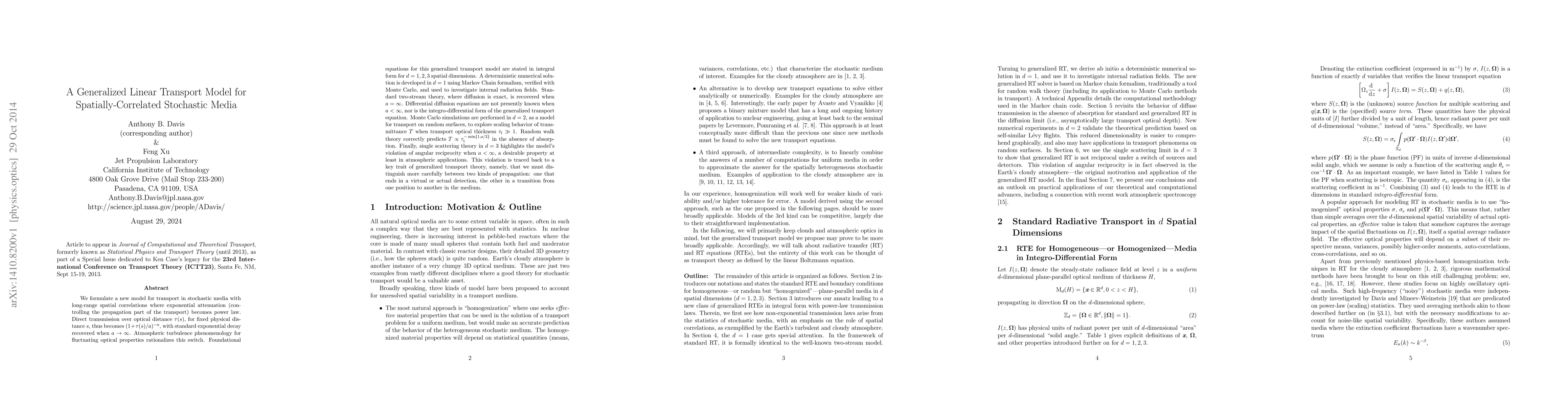 This paper introduces a generalized linear transport model for stochastic media with spatial correlations, where exponential attenuation transitions to power law. The model's foundation is explored in integral form across 1D, 2D, and 3D, and its implications are numerically investigated, revealing deviations from standard diffusion theory and highlighting its relevance in atmospheric applications.
