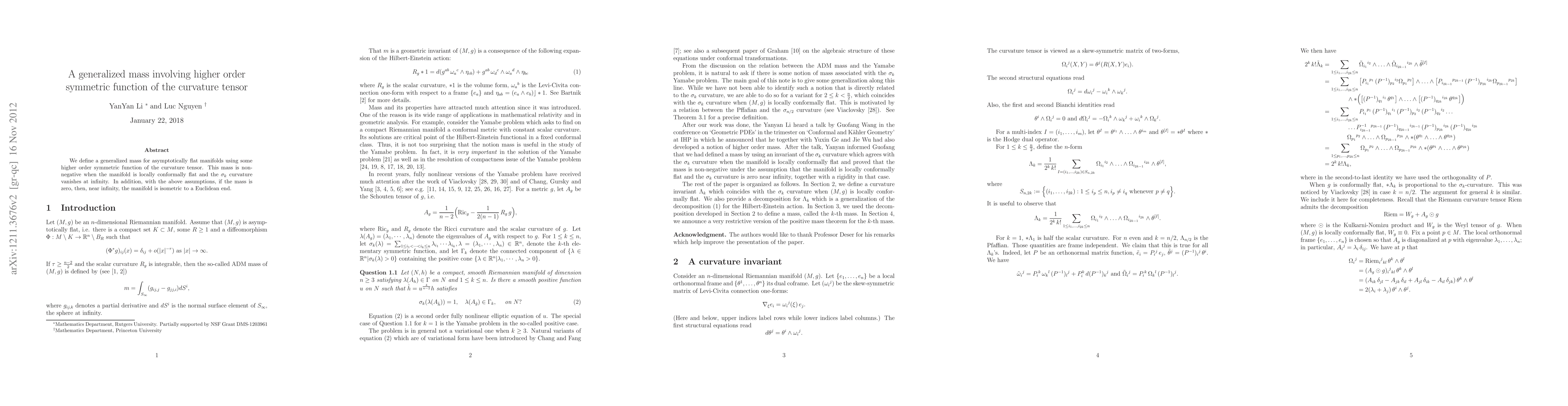This research introduces a new generalized mass for asymptotically flat manifolds, constructed using higher order symmetric functions of the curvature tensor. The mass is non-negative if the manifold is locally conformally flat and its $sigma_k$ curvature vanishes at infinity. Moreover, a zero mass indicates the manifold resembles a Euclidean end near infinity under certain conditions.