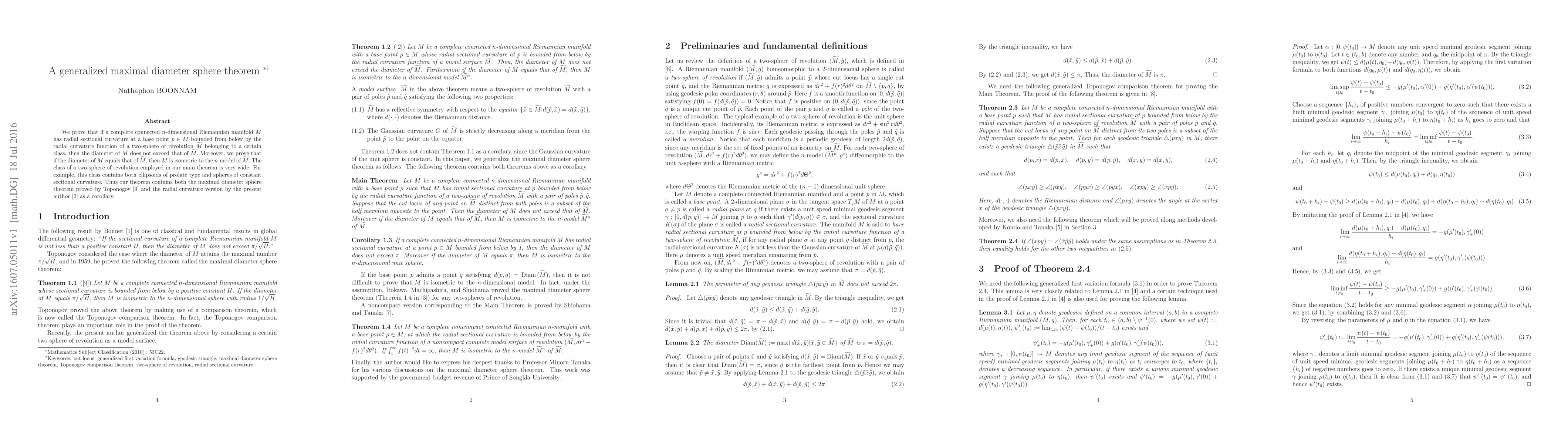 Researchers prove that if a complete connected Riemannian manifold has radial sectional curvature bounded from below by a specific function of a two-sphere, its diameter cannot exceed the diameter of the sphere, with equality implying an isometric embedding.
