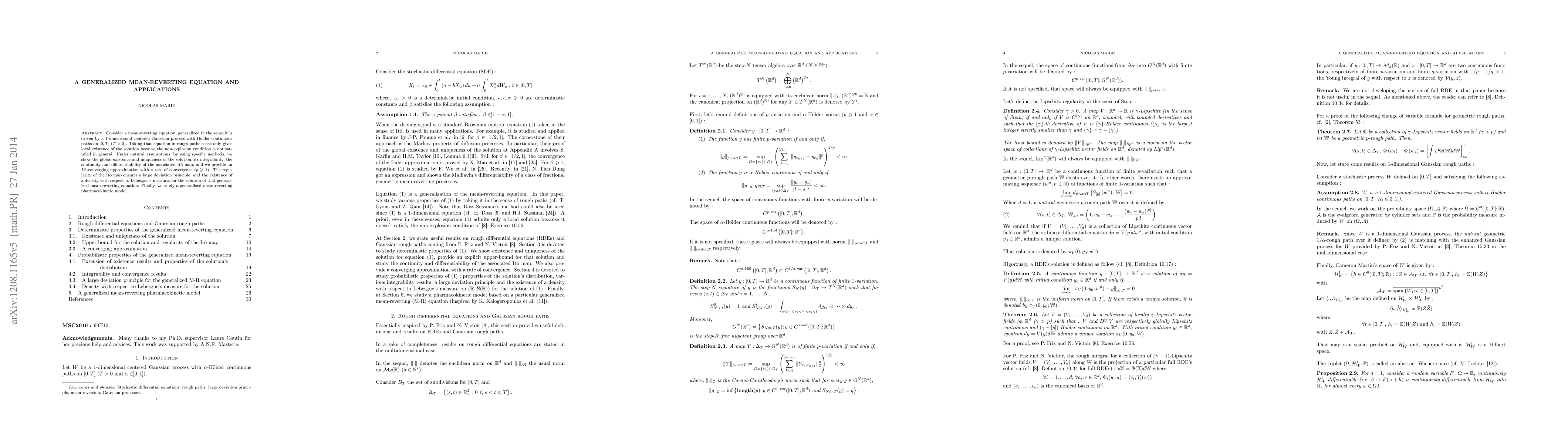 Consider a mean-reverting equation, generalized in the sense it is driven by a 1-dimensional centered Gaussian process with H\"older continuous paths on $[0,T]$ ($T > 0$). Taking that equation in rough paths sense only gives local existence of the solution because the non-explosion condition is not satisfied in general. Under natural assumptions, by using specific methods, we show the global existence and uniqueness of the solution, its integrability, the continuity and differentiability of the associated It\^o map, and we provide an $L^p$-converging approximation with a rate of convergence ($p\geq 1$). The regularity of the It\^o map ensures a large deviation principle, and the existence of a density with respect to the Lebesgue measure, for the solution of that generalized mean-reverting equation. Finally, we study a generalized mean-reverting pharmacokinetic model.