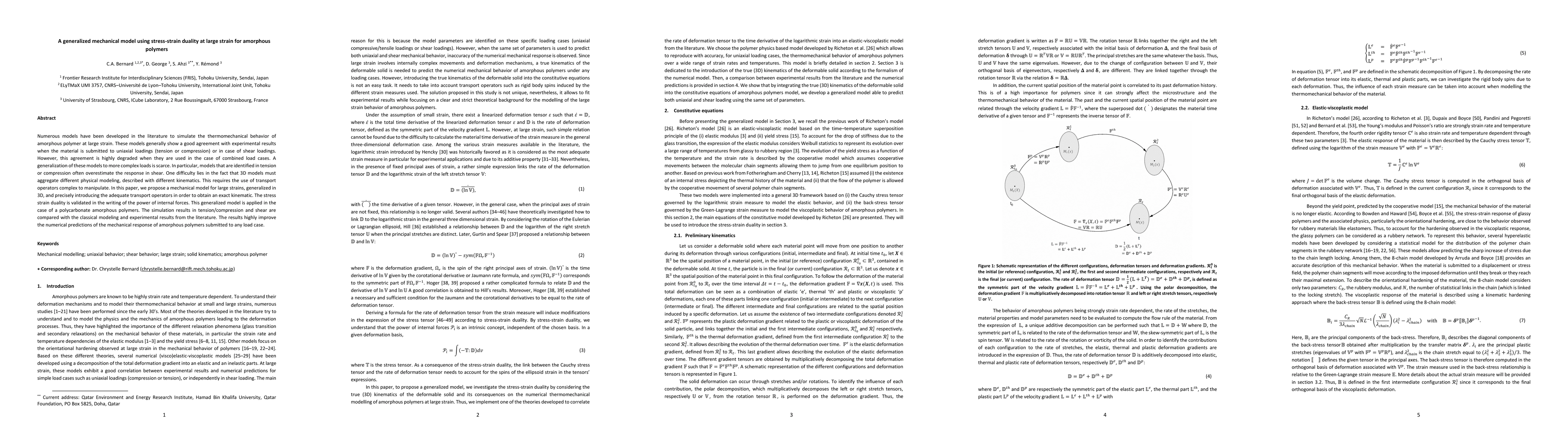 Numerous models have been developed in the literature to simulate the thermomechanical behavior of amorphous polymer at large strain. These models generally show a good agreement with experimental results when the material is submitted to uniaxial loadings (tension or compression) or in case of shear loadings. However, this agreement is highly degraded when they are used in the case of combined load cases. A generalization of these models to more complex loads is scarce. In particular, models that are identified in tension or compression often overestimate the response in shear. One difficulty lies in the fact that 3D models must aggregate different physical modeling, described with different kinematics. This requires the use of transport operators complex to manipulate. In this paper, we propose a mechanical model for large strains, generalized in 3D, and precisely introducing the adequate transport operators in order to obtain an exact kinematic. The stress strain duality is validated in the writing of the power of internal forces. This generalized model is applied in the case of a polycarbonate amorphous polymers. The simulation results in tension/compression and shear are compared with the classical modeling and experimental results from the literature. The results highly improve the numerical predictions of the mechanical response of amorphous polymers submitted to any load case.