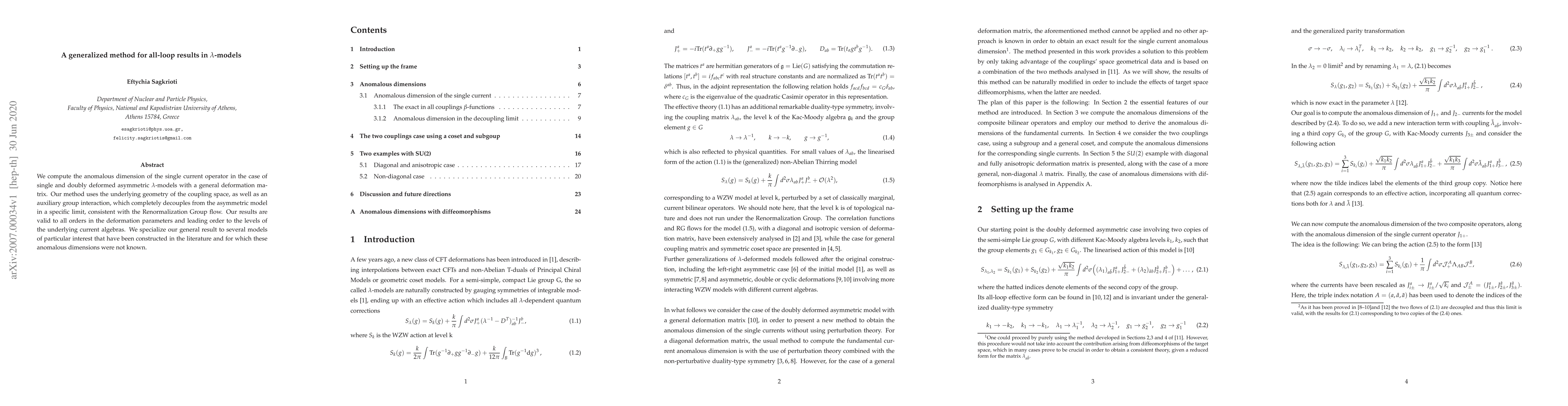We compute the anomalous dimension of the single current operator in the case of single and doubly deformed asymmetric $\lambda$-models with a general deformation matrix. Our method uses the underlying geometry of the coupling space, as well as an auxiliary group interaction, which completely decouples from the asymmetric model in a specific limit, consistent with the Renormalization Group flow. Our results are valid to all orders in the deformation parameters and leading order to the levels of the underlying current algebras. We specialize our general result to several models of particular interest that have been constructed in the literature and for which these anomalous dimensions were not known.