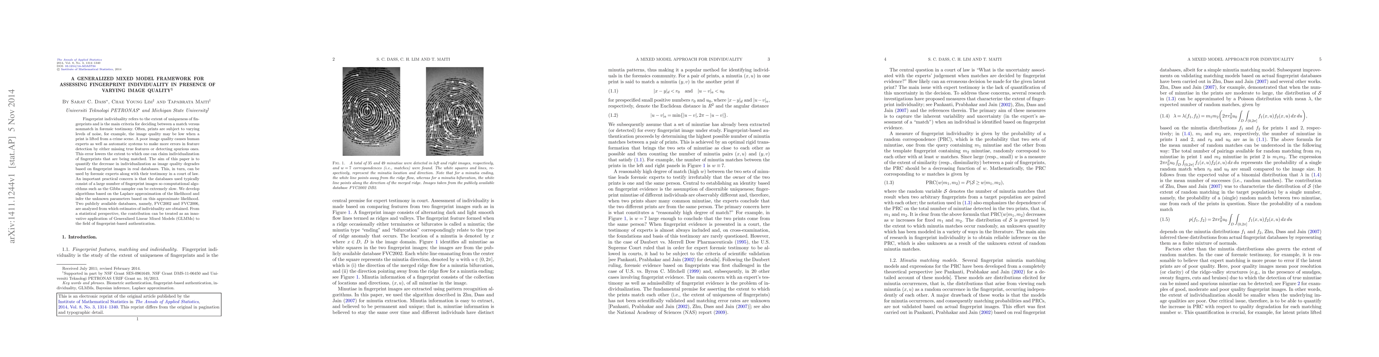 Fingerprint individuality refers to the extent of uniqueness of fingerprints and is the main criteria for deciding between a match versus nonmatch in forensic testimony. Often, prints are subject to varying levels of noise, for example, the image quality may be low when a print is lifted from a crime scene. A poor image quality causes human experts as well as automatic systems to make more errors in feature detection by either missing true features or detecting spurious ones. This error lowers the extent to which one can claim individualization of fingerprints that are being matched. The aim of this paper is to quantify the decrease in individualization as image quality degrades based on fingerprint images in real databases. This, in turn, can be used by forensic experts along with their testimony in a court of law. An important practical concern is that the databases used typically consist of a large number of fingerprint images so computational algorithms such as the Gibbs sampler can be extremely slow. We develop algorithms based on the Laplace approximation of the likelihood and infer the unknown parameters based on this approximate likelihood. Two publicly available databases, namely, FVC2002 and FVC2006, are analyzed from which estimates of individuality are obtained. From a statistical perspective, the contribution can be treated as an innovative application of Generalized Linear Mixed Models (GLMMs) to the field of fingerprint-based authentication.