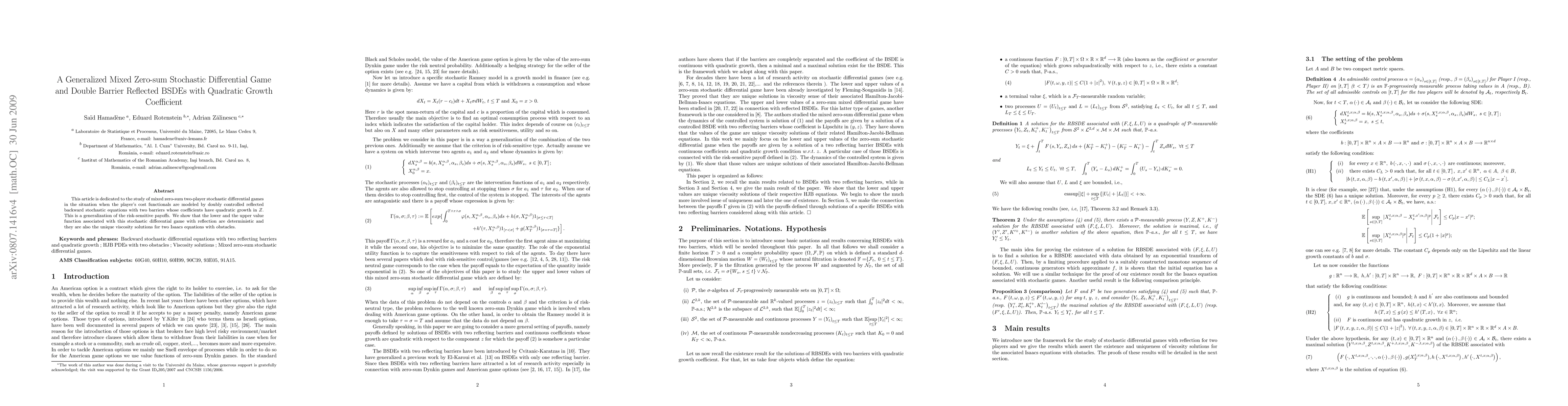 This article is dedicated to the study of mixed zero-sum two-player stochastic differential games in the situation when the player's cost functionals are modeled by doubly controlled reflected backward stochastic equations with two barriers whose coefficients have quadratic growth in Z. This is a generalization of the risk-sensitive payoffs. We show that the lower and the upper value function associated with this stochastic differential game with reflection are deterministic and they are also the unique viscosity solutions for two Isaacs equations with obstacles.