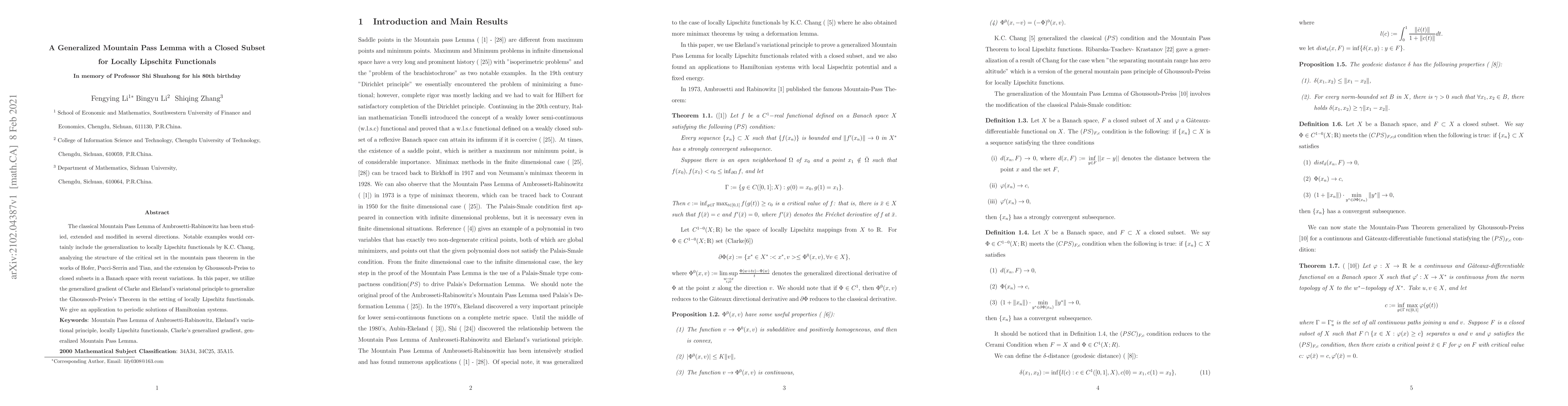 The classical Mountain Pass Lemma of Ambrosetti-Rabinowitz has been studied, extended and modified in several directions. Notable examples would certainly include the generalization to locally Lipschitz functionals by K.C. Chang, analyzing the structure of the critical set in the mountain pass theorem in the works of Hofer, Pucci-Serrin and Tian, and the extension by Ghoussoub-Preiss to closed subsets in a Banach space with recent variations. In this paper, we utilize the generalized gradient of Clarke and Ekeland's variatonal principle to generalize the Ghoussoub-Preiss's Theorem in the setting of locally Lipschitz functionals. We give an application to periodic solutions of Hamiltonian systems.