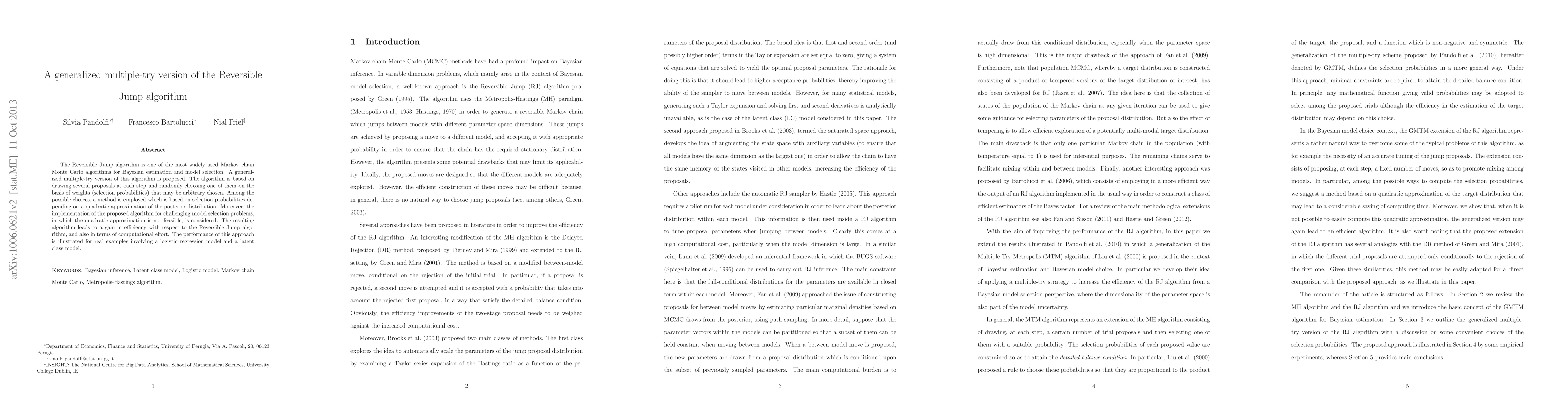 This paper proposes a generalized multiple-try version of the Reversible Jump algorithm, which draws multiple proposals at each step and selects one based on arbitrary weights. The method improves efficiency and computational effort compared to the standard algorithm, and its effectiveness is demonstrated through logistic regression and latent class models.