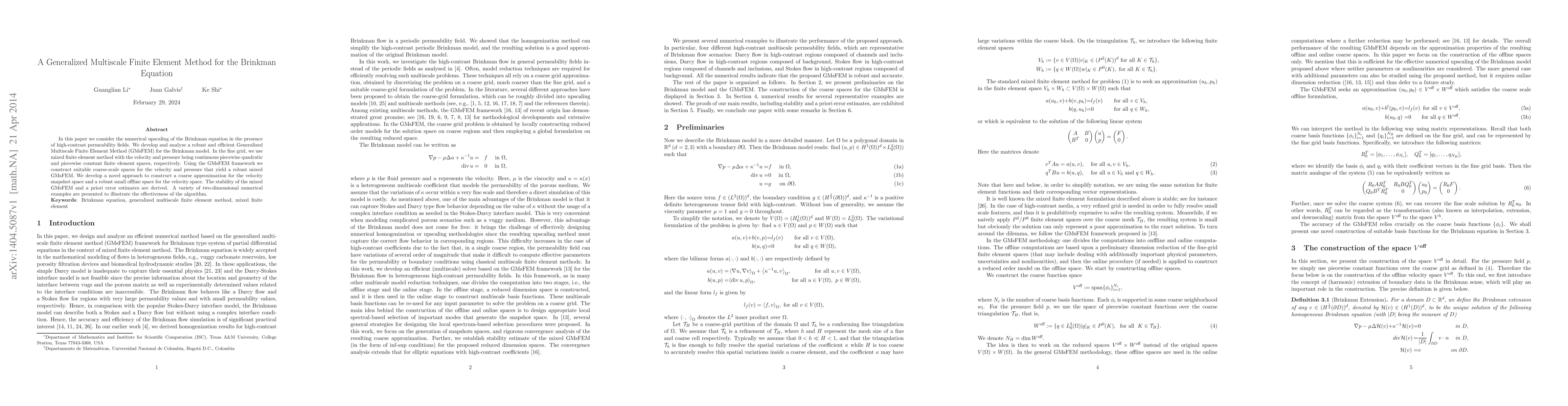 This paper develops a Generalized Multiscale Finite Element Method (GMsFEM) for numerically upscaling the Brinkman equation in heterogeneous media. The method combines mixed finite elements with robust coarse-scale spaces, demonstrating stability and efficiency through a priori error estimates and numerical examples.