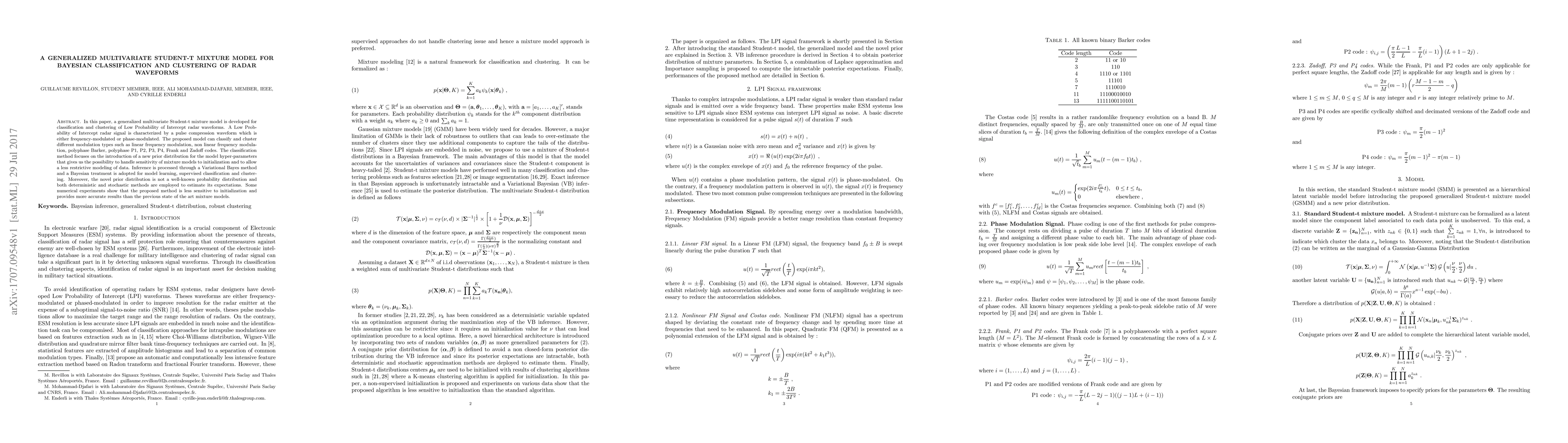 This paper introduces a generalized multivariate Student-t mixture model for classifying and clustering Low Probability of Intercept radar waveforms, employing a novel prior distribution to enhance model robustness and accuracy. The method outperforms existing models in sensitivity and precision, as demonstrated through numerical experiments.