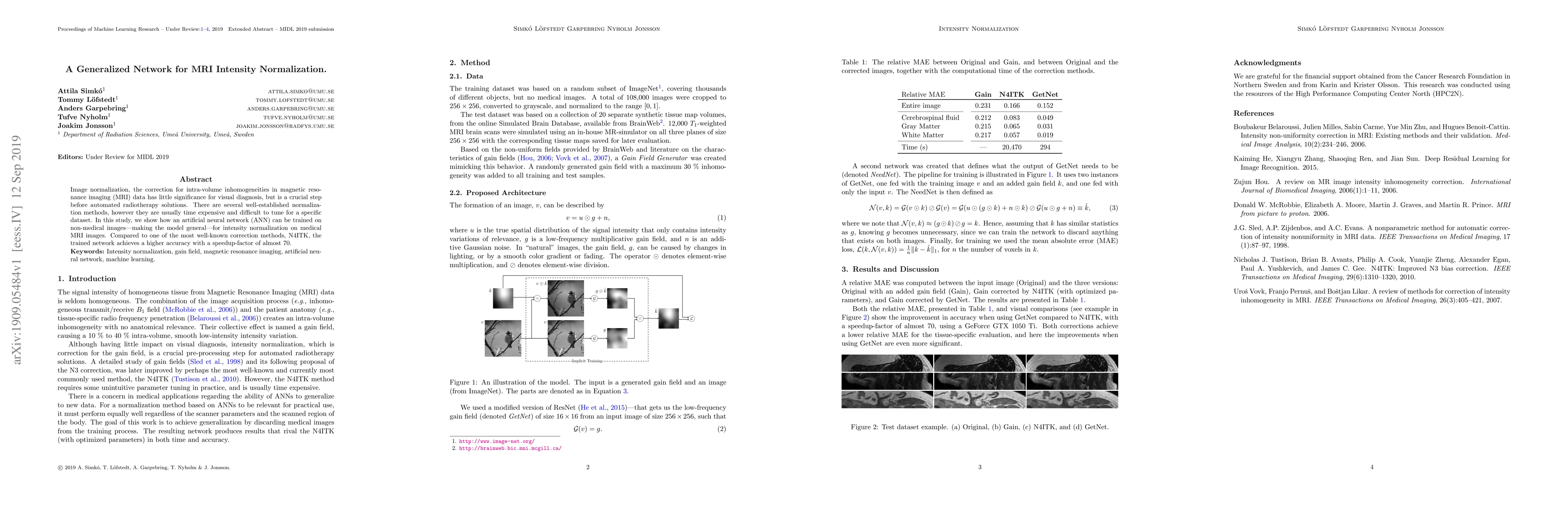This research introduces a neural network model for MRI intensity normalization, trained on non-medical images to generalize for medical MRI data. The model outperforms the traditional N4ITK method with higher accuracy and a 70x speedup.
