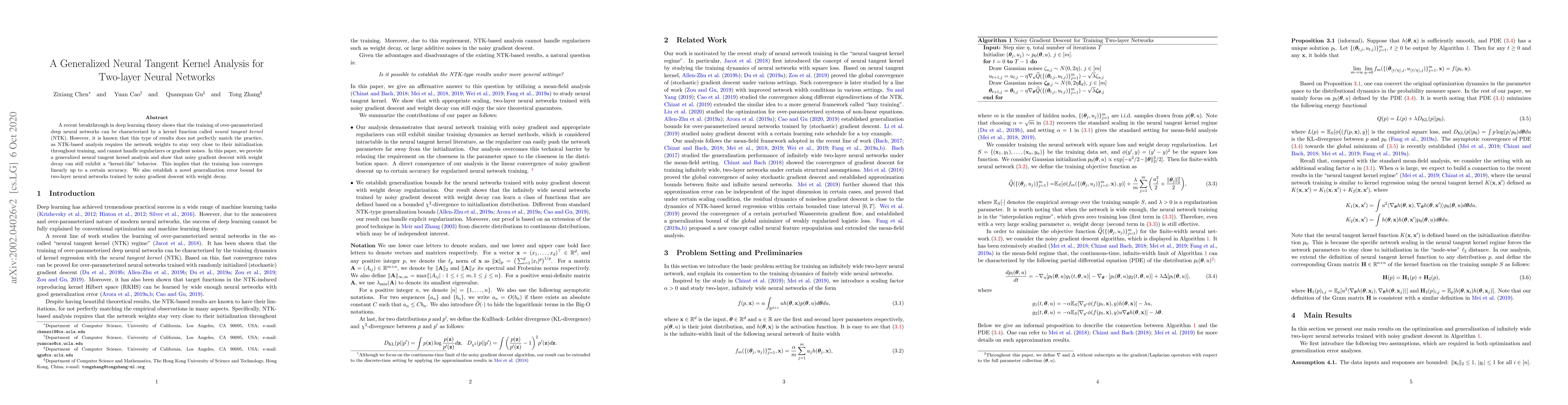 A recent breakthrough in deep learning theory shows that the training of over-parameterized deep neural networks can be characterized by a kernel function called \textit{neural tangent kernel} (NTK). However, it is known that this type of results does not perfectly match the practice, as NTK-based analysis requires the network weights to stay very close to their initialization throughout training, and cannot handle regularizers or gradient noises. In this paper, we provide a generalized neural tangent kernel analysis and show that noisy gradient descent with weight decay can still exhibit a "kernel-like" behavior. This implies that the training loss converges linearly up to a certain accuracy. We also establish a novel generalization error bound for two-layer neural networks trained by noisy gradient descent with weight decay.