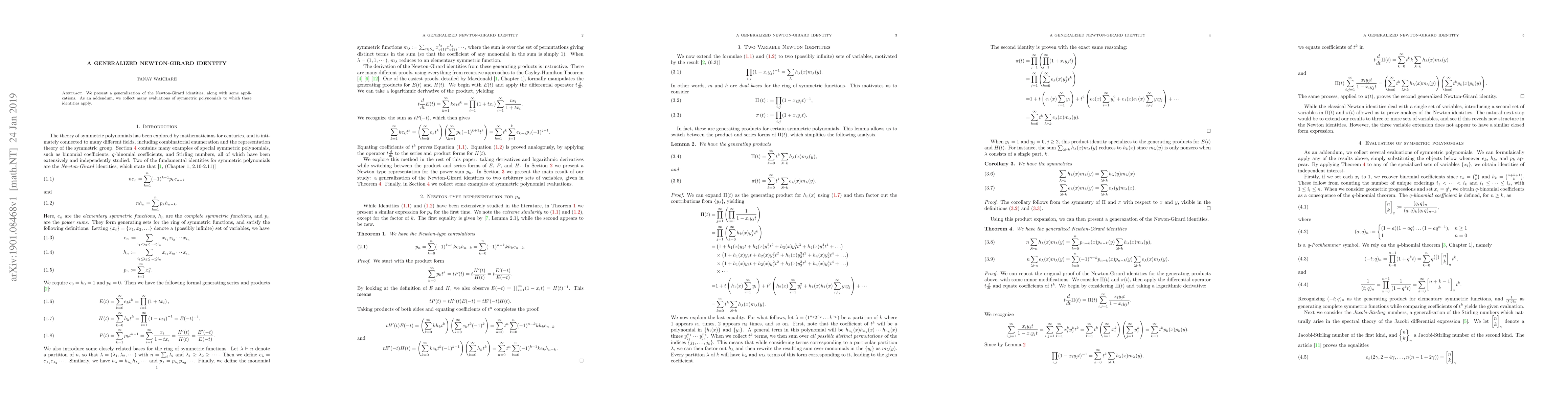 Summary: This paper generalizes the Newton-Girard identities and explores their applications, providing evaluations of symmetric polynomials relevant to these identities. The work extends classical results with new insights and practical implications.