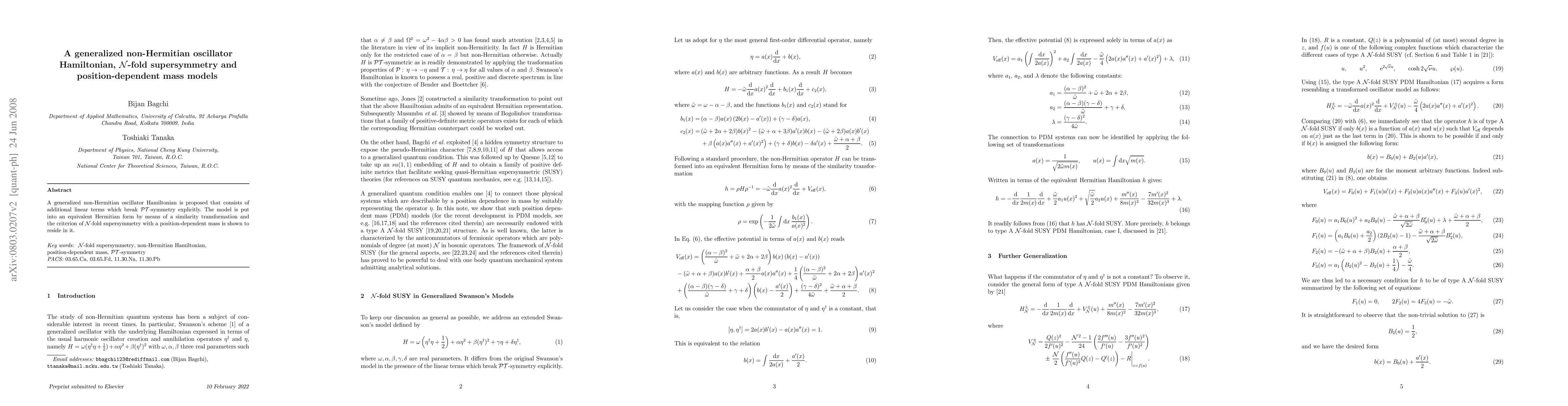 Summary: A generalized non-Hermitian oscillator Hamiltonian is introduced with explicit PT-symmetry breaking terms, transformed into a Hermitian form, and demonstrated to exhibit N-fold supersymmetry with a position-dependent mass.