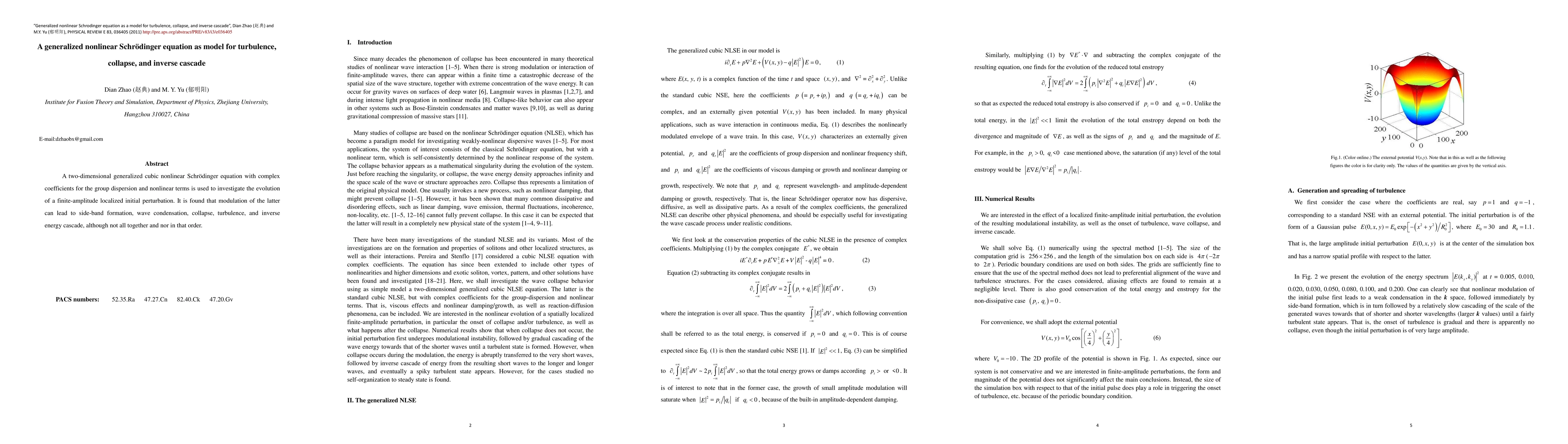 A two-dimensional generalized cubic nonlinear Schr\"odinger equation with complex coefficients for the group dispersion and nonlinear terms is used to investigate the evolution of a finite-amplitude localized initial perturbation. It is found that modulation of the latter can lead to side-band formation, wave condensation, collapse, turbulence, and inverse cascade, although not all together nor in that order.