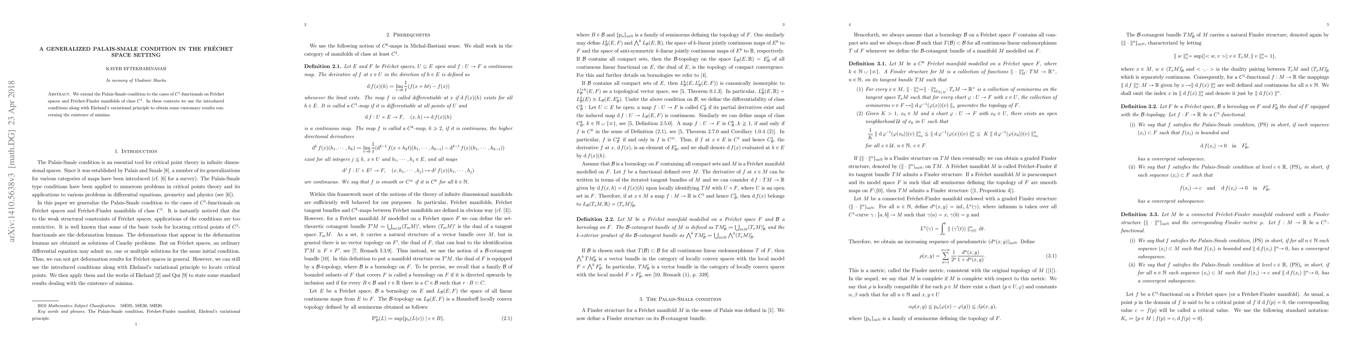 This paper extends the Palais-Smale condition for $C^1$-functionals in Fr\'echet spaces and $C^1$ Fr\'echet-Finsler manifolds, utilizing Ekeland's variational principle to establish the existence of minima.