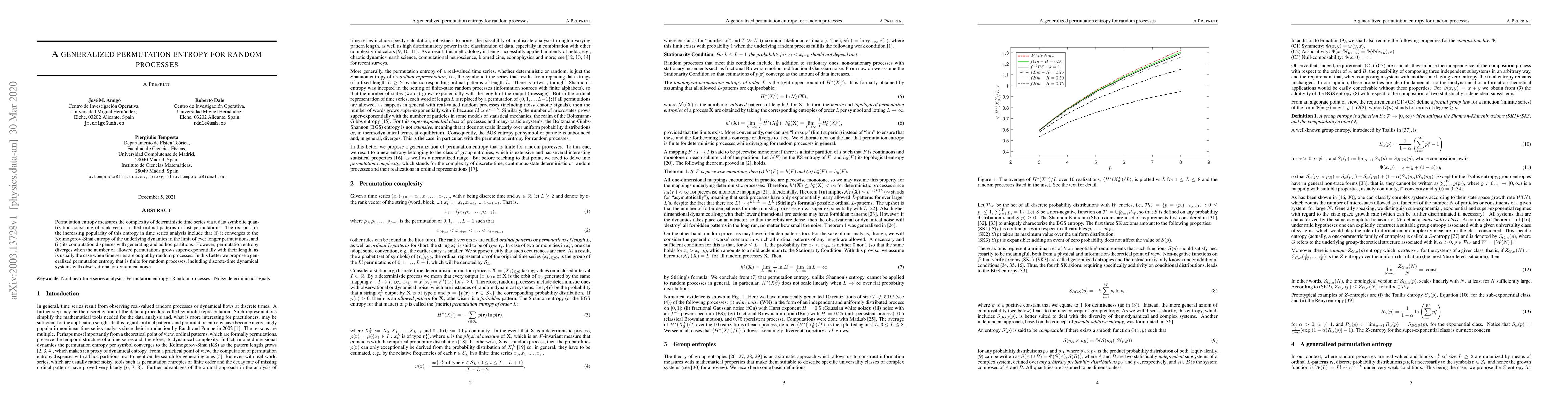 Permutation entropy measures the complexity of deterministic time series via a data symbolic quantization consisting of rank vectors called ordinal patterns or just permutations. The reasons for the increasing popularity of this entropy in time series analysis include that (i) it converges to the Kolmogorov-Sinai entropy of the underlying dynamics in the limit of ever longer permutations, and (ii) its computation dispenses with generating and ad hoc partitions. However, permutation entropy diverges when the number of allowed permutations grows super-exponentially with their length, as is usually the case when time series are output by random processes. In this Letter we propose a generalized permutation entropy that is finite for random processes, including discrete-time dynamical systems with observational or dynamical noise.