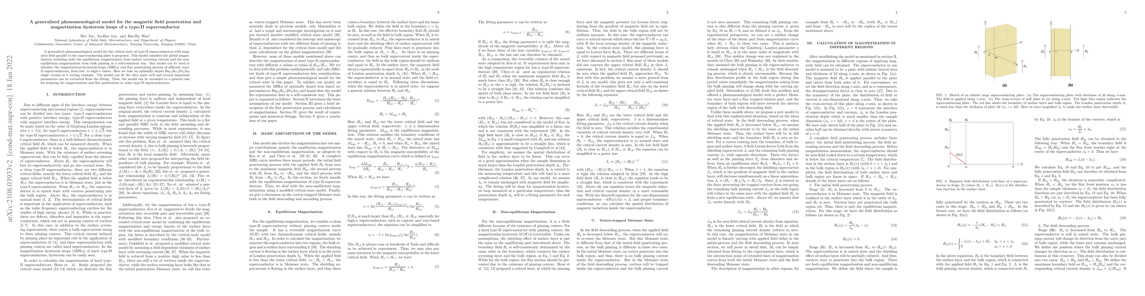A generalized phenomenological model for the critical state of type-II superconductors with magnetic field parallel to the superconducting plate is proposed. This model considers the global magnetization including both the equilibrium magnetization from surface screening current and the non-equilibrium magnetization from bulk pinning in a self-consistent way. Our model can be used to simulate the magnetization-hysteresis-loops (MHLs) and flux penetrating process of different type-II superconductors, from low- to high-kappa values. Here we take an optimally doped Ba0.6K0.4Fe2As2 single crystal as a testing example. The model can fit the data quite well and several important parameters can be extracted from the fitting. Thus, the model can be extended to a general case for studying the magnetization and flux penetration in other type-II superconductors.